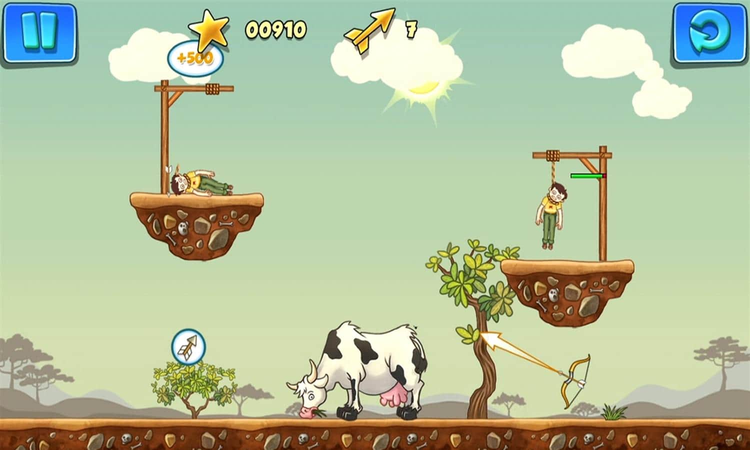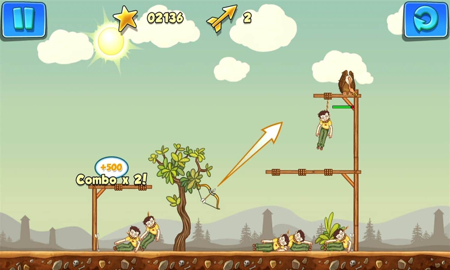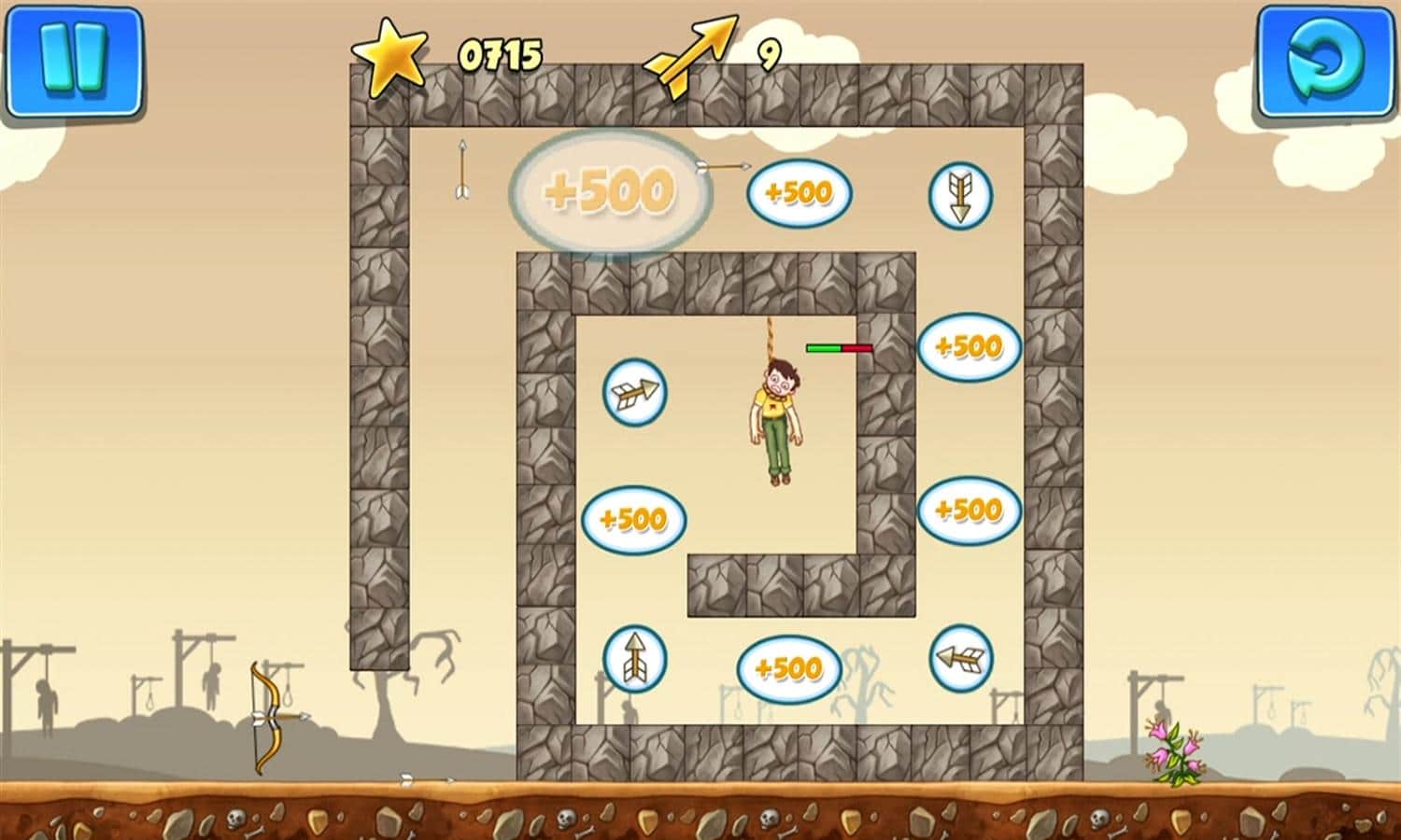Gibbets 2 - веселая головоломка, в которой вы будет спасать людей весящих на виселице с помощью стрел. Стреляйте из лука по веревкам и не дайте людям, весящим на них, испустить последнее дыхание. Стреляйте точнее, чтобы не попасть по весящим, а также используйте порталы и бонусы чтобы помочь несчастным. Пройдите все 50 уровней и заработайте максимальное количество очков для того чтобы посоревноваться с друзьями.