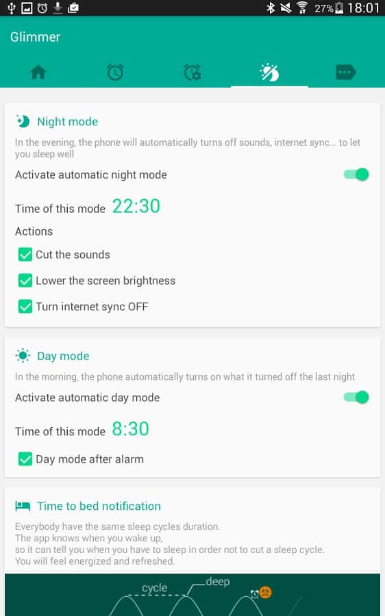 Часто случается, что будильник, поставленный одним членом семьи в результате будит всех. Как избежать этой неприятной ситуации, но не проспать самому? Как вариант,воспользоваться нестандартным будильником, который использует не звук, а свет. Примерно за полчаса до времени подъема на смартфоне зажжется подсветка, которая будет постепенно нарастать, а через некоторое время начнет проигрываться мелодия, которая тоже будет нарастать постепенно.