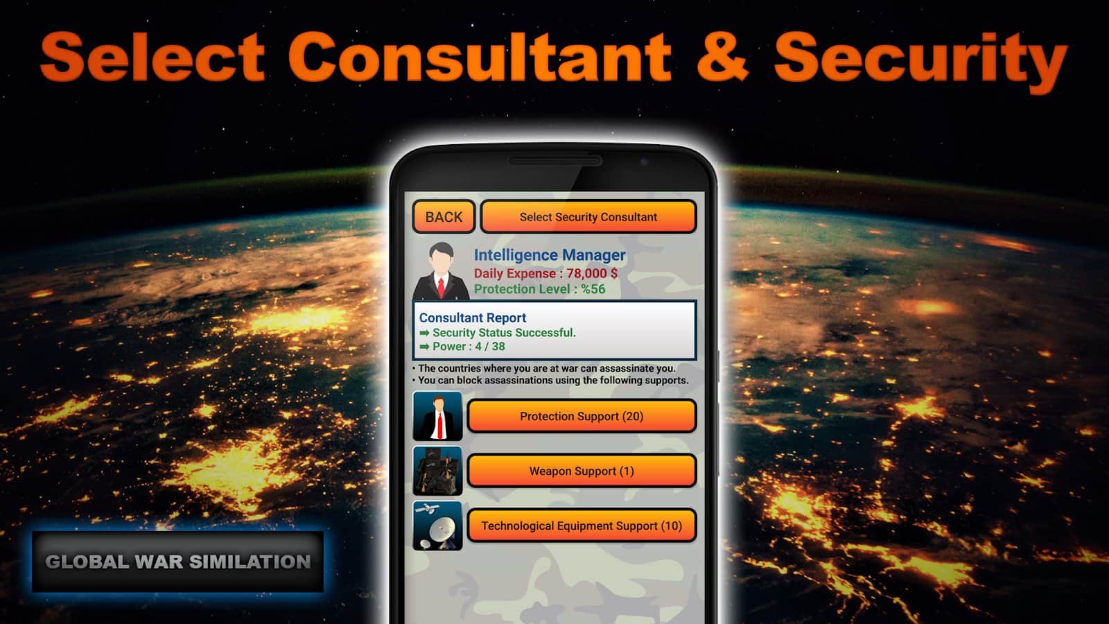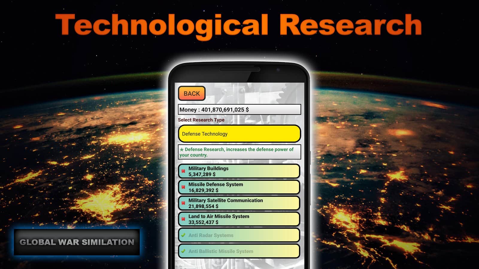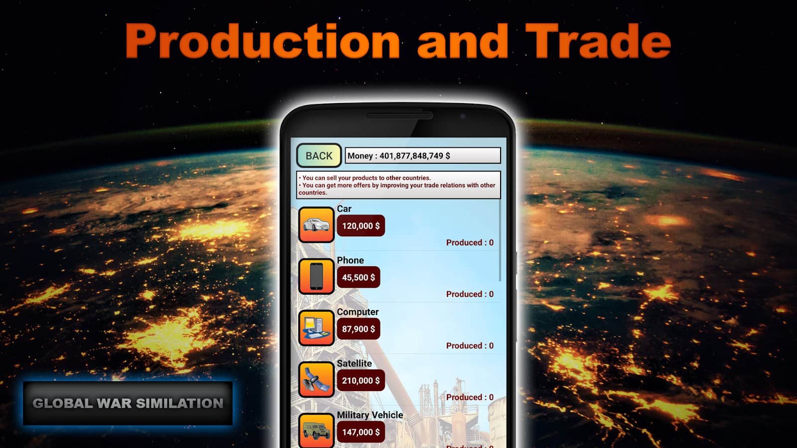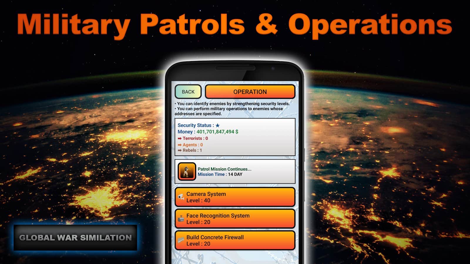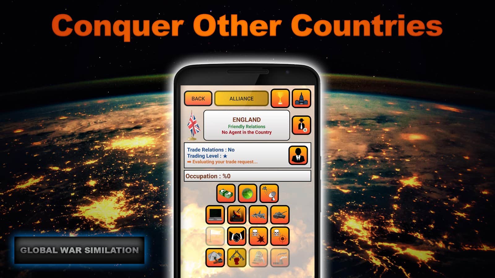 Global War Simulation - военно экономическая стратегия на Android, в которой вам потребуется управлять своей страной, развивая ее. Инвестируйте и изучайте в различные отрасли, такие как: шпионаж, экономика, налоги, инвестиции, исследования и множество других. Собирать военную и экономическую разведку по странам и получайте военные, экономические, политические, разведывательные, военные, отчеты со всего мира. Разрабатывайте стратегии и управляйте своими людьми. Вы сможете вторгаться в другие страны и даже захватить весь мир. Вступайте в альянсы, чтобы развиваться вместе с остальными странами и помогать друг другу. Выбор за вами.