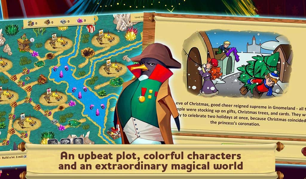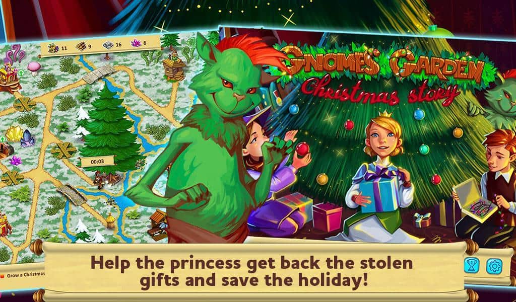 Gnomes Garden: Christmas story - новогодняя стратегия сюжет которой разворачивается в неком сказочном королевстве. Все жители мира готовятся к праздникам, однако злобный тролль живущий по соседству вовсе не рад такому повороту и однажды собрав своих друзей похитил Новогоднюю елку. Теперь вам вместе с принцессой предстоит отправиться в путешествие по королевству и постараться отыскать зеленую красавицу. Игровой процесс разделен на множество заданий, как от совсем простых по добыче ресурсов и строительства, до решение замысловатых головоломок.