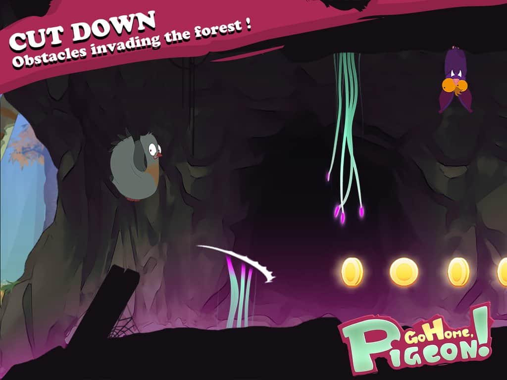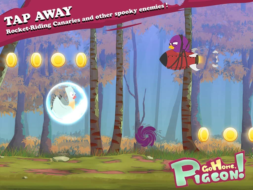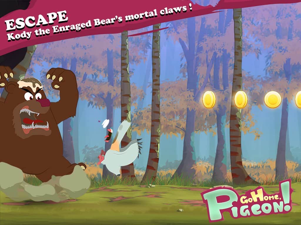 Go Home, Pigeon ! - Новый, интересный и довольно простой раннер на наши с вами андроид девайсы. Разработчики игры предлагают нам помочь молодой голубке пролететь через весь лес и спасти её жизнь. Вас ждут множество препятствий, пещер, различные животные, в том числе и медведь! Но не забывайте также собирать монетки которые непременно вам пригодятся!