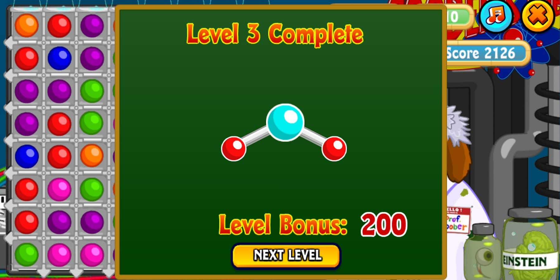 Goober's Lab – увлекательная игра на андроид, из жанра три в ряд. В этой игре вы перенесетесь в лабораторию где будете помогать Губеру найти нужную ему формулу. Наш герой так давно занимается своими исследованиями, что уже давно забыл какую формулу ему необходимо найти. Составляйте ряды из трех и более атомов и весело проводите свое свободное время, решая многочисленные задачки. Составляйте как можно больше одинаковых атомов в ряд таким образом вы получите больше очков. Создавайте нестабильные атомы и получайте бонусные и наполняйте жидкостью колбу, главного героя проходя уровень.