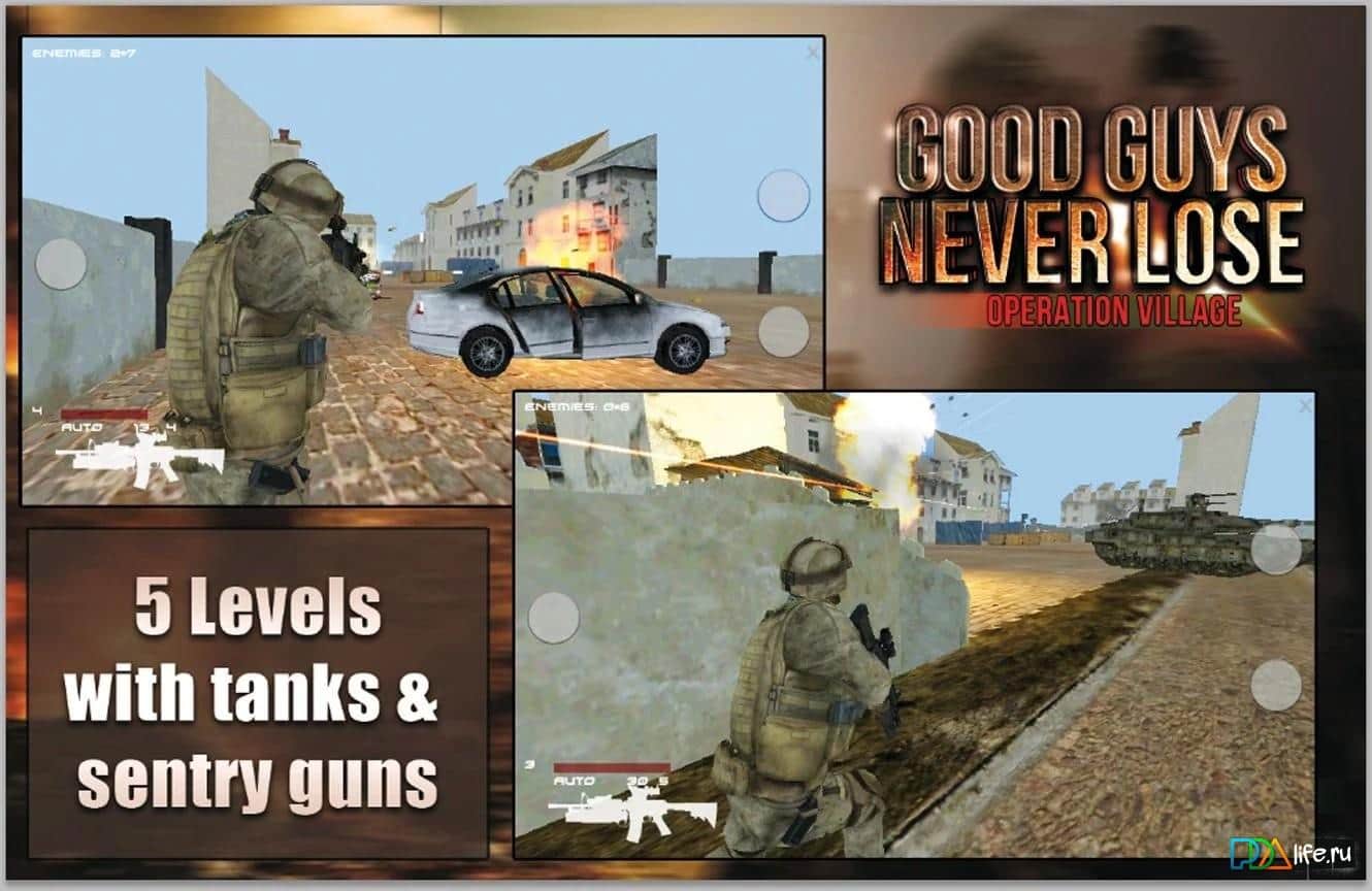 Good Guys Village Ops 3d - Трехмерный шутер на андроид против толп террористов. Вас ждет 5 уникальных кампаний с интересными уровнями где вам предстоит показать все свое мастерство. Хорошо просматривайте локацию, ведь враги будут прятаться и скрываться за укрытия. Так же остерегайтесь взрывов, они не просто заберут часть жизни, а убьет мгновенно. В игре не плохая графика и физика.