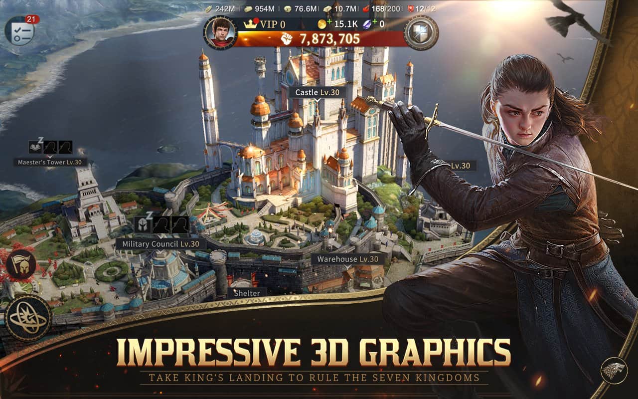 Особенностью игры стал визуальный эффект с тонким художественным 3D дизайном. Полная копия замков позволит максимально погрузиться в реалистичный мир Вестероса. Пейзаж меняется со временем в реальном мире - от светлого дня до лунной ночи. Также вы сможете увидеть дизайн смены четырех сезонов: весна с цветущей сакурой, лето с зеленью повсюду, осень с желтеющей листвой и зима с падающими снежинками.
