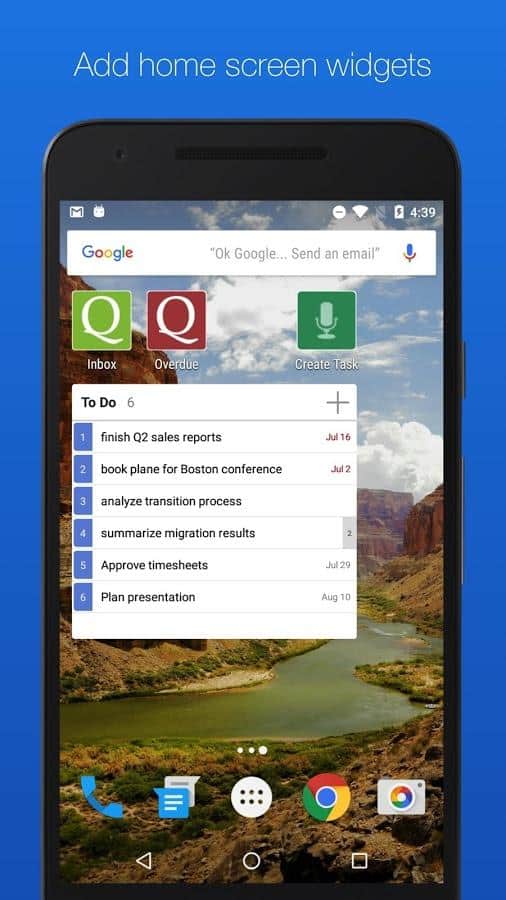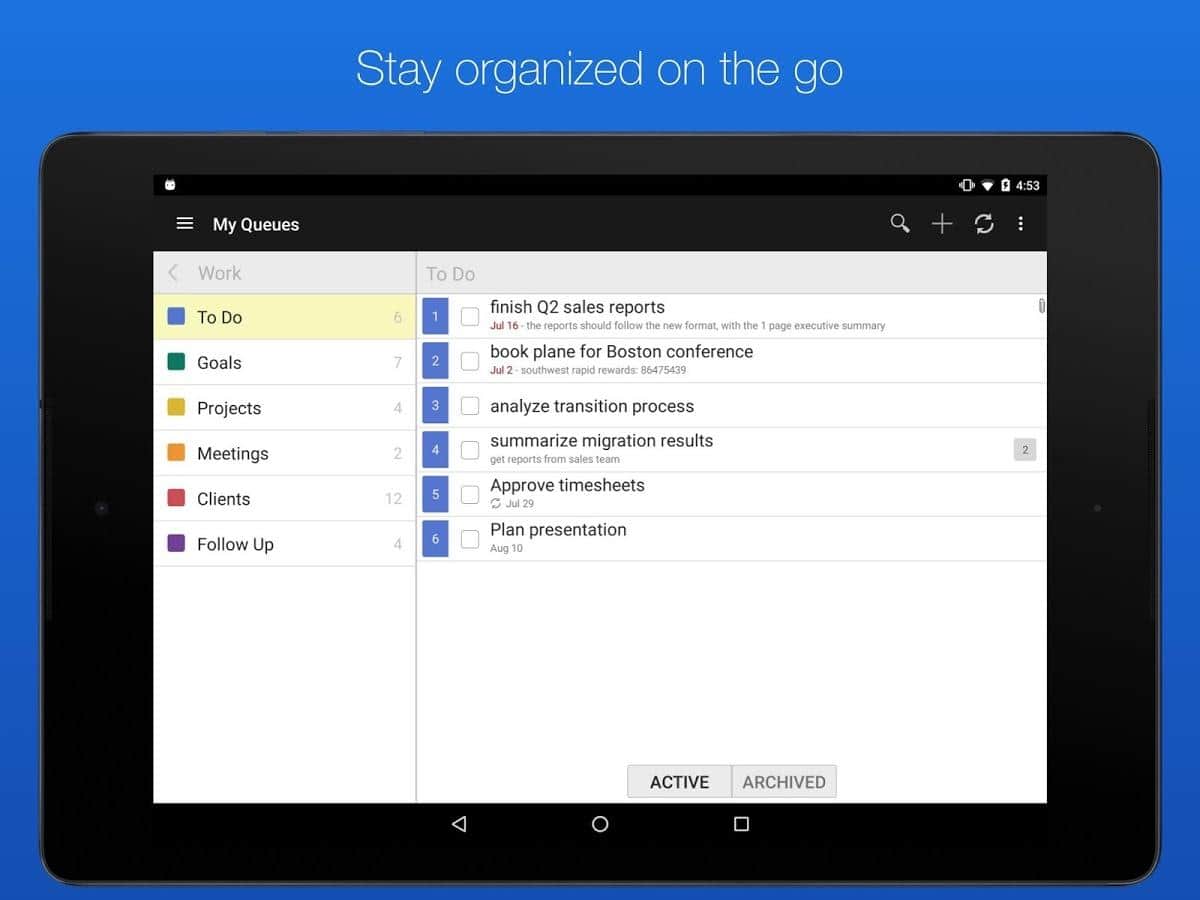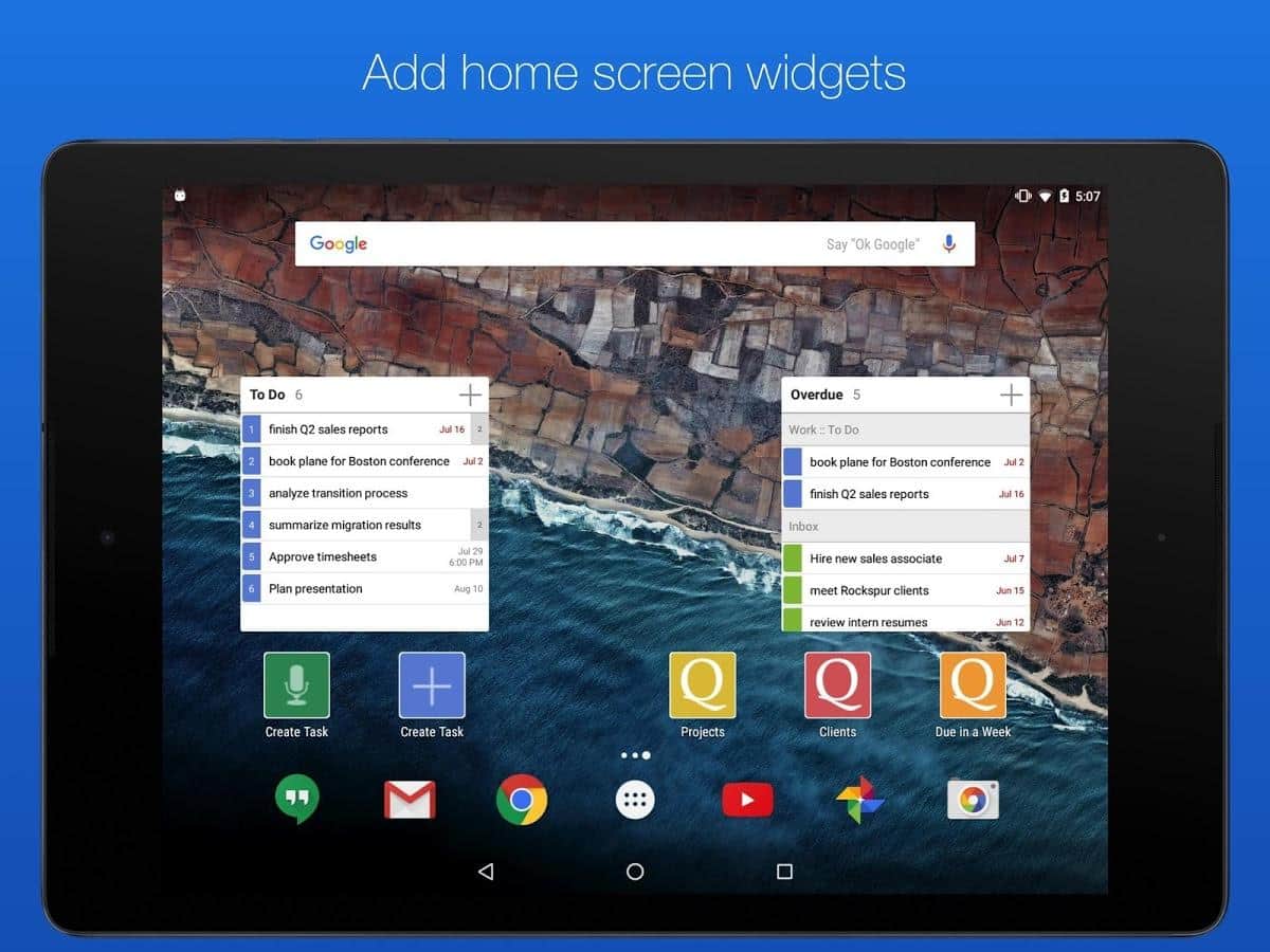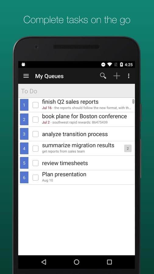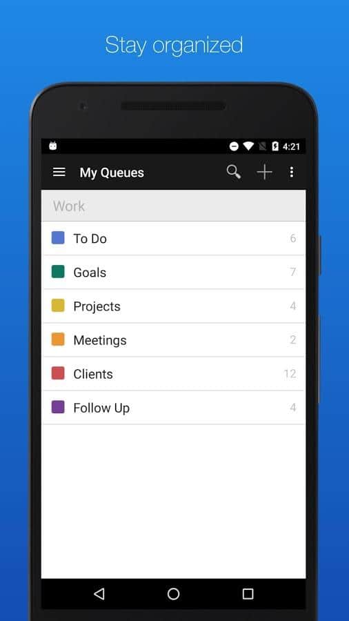 GQueues | Tasks & To-Do Lists – хорошее приложение вместившее в себя такие ряд таких удобных задач как: двухсторонняя синхронизация с гугл календарем, возможность создания категорий, сохранение результатов поиска, менеджер задач, есть возможность создания виджетов на рабочий стол и многое другое.