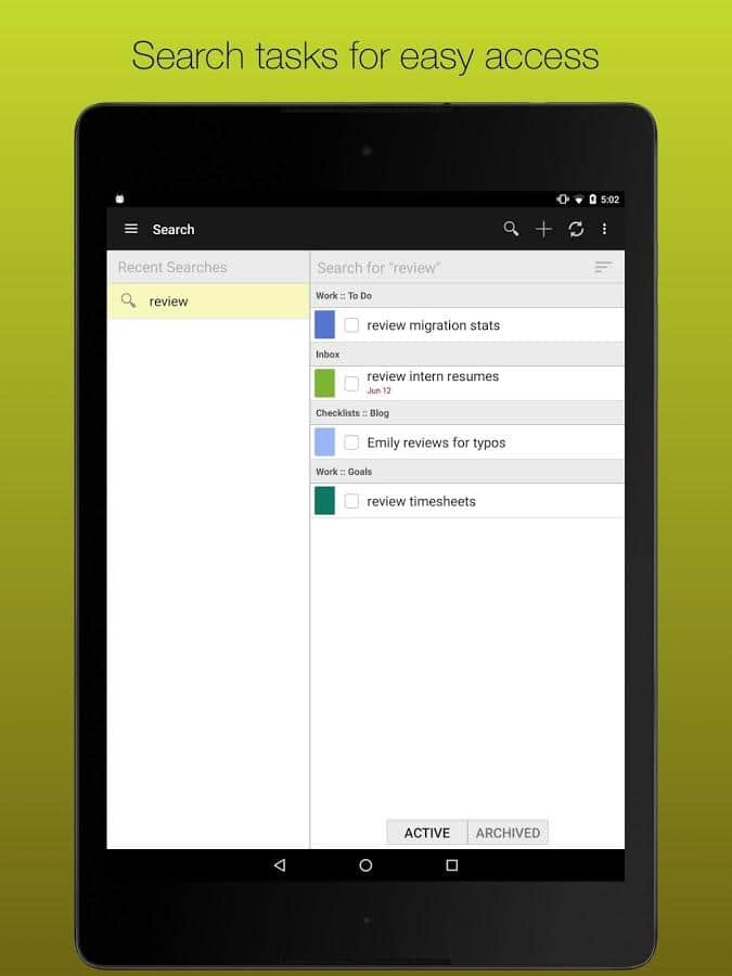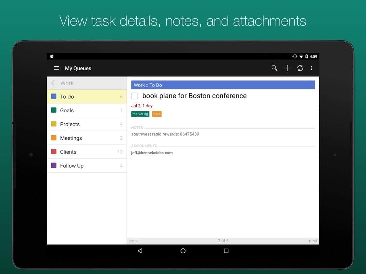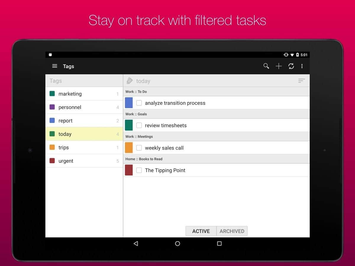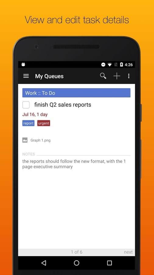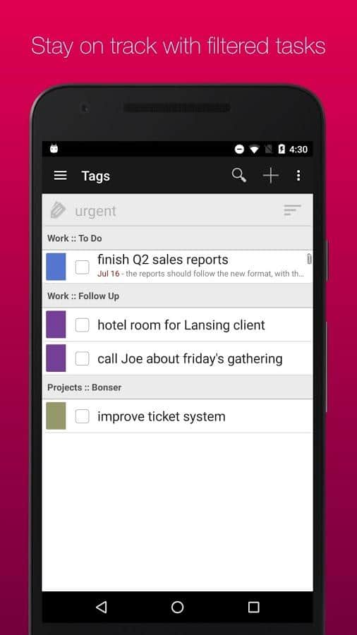 GQueues | Tasks & To-Do Lists – хорошее приложение вместившее в себя такие ряд таких удобных задач как: двухсторонняя синхронизация с гугл календарем, возможность создания категорий, сохранение результатов поиска, менеджер задач, есть возможность создания виджетов на рабочий стол и многое другое.