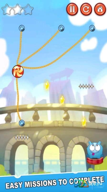 Grab The Candy - Sunny Day – накормите Ями вкусными конфетами роняя их главному герою прямо в рот. Эта игра перенесет вас в красочный мир, где вам предстоит кормить вкусными конфетами забавного персонажа. Конфета подвешена на нескольких веревках высоко над головой героя, вашей задачей будет в нужный момент резать веревки и отправлять конфету в рот Яма. Будьте предельно внимательны и перед тем как обрезать последнюю веревку, убедитесь что вы собрали все звезды на уровне и только затем обрезайте последнюю. Конфета должна попасть в рот забавному герою при этом не столкнуться с двигающейся платформой и другими преградами. Сделайте вашего героя счастливым, накормив его конфетами.