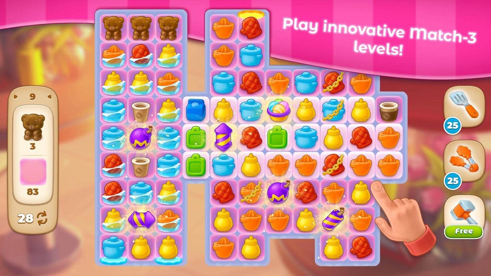 В игре Grand Cafe Story вам предстоит собирать одинаковые предметы на кулинарные тематику по типу "Три в ряд".