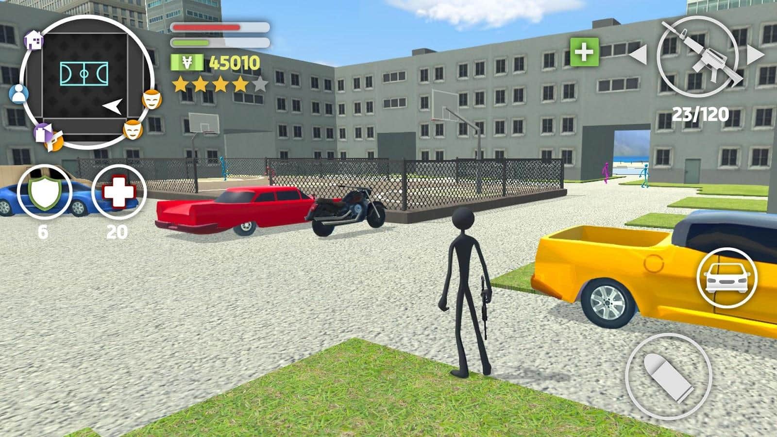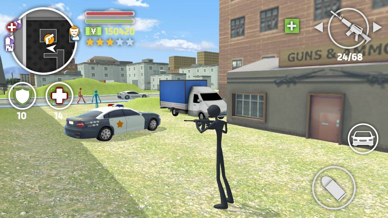 Grand Stickman Auto V – захватывающий экшен на андроид, где вы будете исследовать огромный город и выполнять различные миссии. Откройте для себя динамичный и многогранный открытый мир, где вы в качестве Стикмена будете перемещаться по улицам города и вести бой с бандитами, гангстерами, криминальными бандами и продажными полицейскими. Выбирайте себе подходящий арсенал оружия, начиная от пистолетов и снайперских винтовок и заканчивая пулеметами и гранатометами. Ездите на спортивных автомобилях и гоняйте на мощных мотоциклах, исследуя улицы города. Постреляйте от души в этой игре и покажите лучшие результаты.