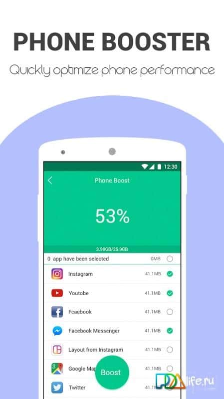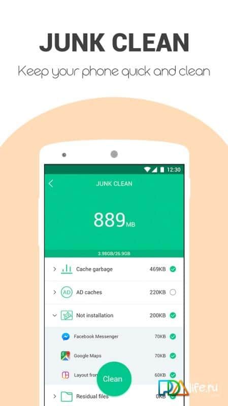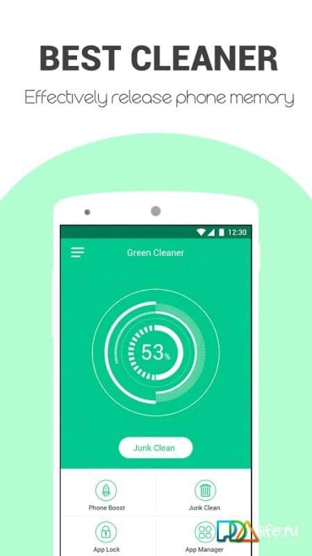 Green Cleaner - Существует множество приложений для очистки смартфона, так и это приложение имеет вполне себе стандартные функции. С его помощью вы сможете очистить память а так же озу своего устройства. Сделать это будет несложно ведь удобный интерфейс подразумевает в себе очистку всего в одно касание. Однако если вы хотите выбрать что именно удалять то вам будет предложен список в котором вы сможете выбрать какие элементы нужно оставить а какие удалить.