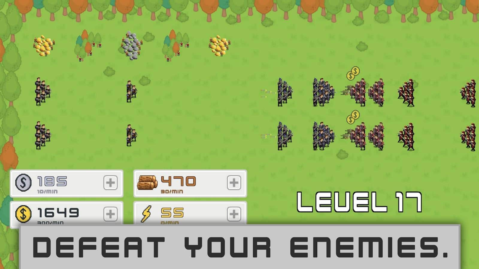 Симулятор ожидания, а не стратегия. Ресурсы накапливаются медленно для улучшения юнитов и покупки новых. Расстановка войск проста и примитивна. У юнитов нет слабых сторон практически. Спереди щитоносцы, далее мечники, а потом саппорты (лучники, катапульты, вышки и башни)