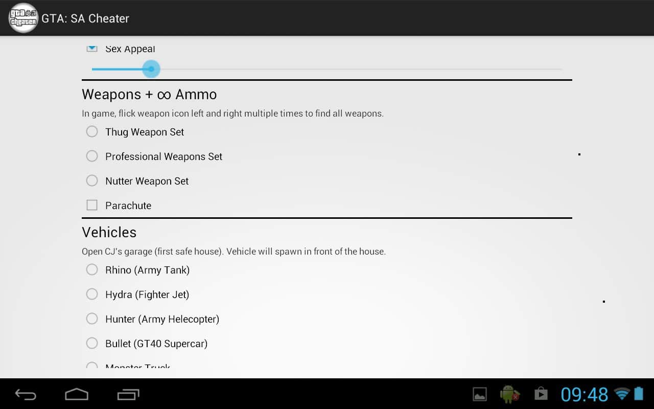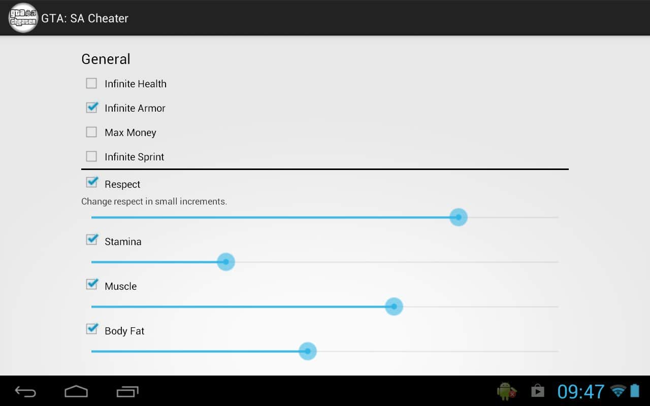 GTA: San Andreas Cheater – программа на андроид которая позволяет применять читы к известной игре GTA: San Andreas. Просто перед игрой вводим нужные вам читы сохраняем их и наслаждаемся игрой с уже изменёнными характеристиками вашего персонажа, но помните что играть без читов гораздо интереснее и увлекательнее.