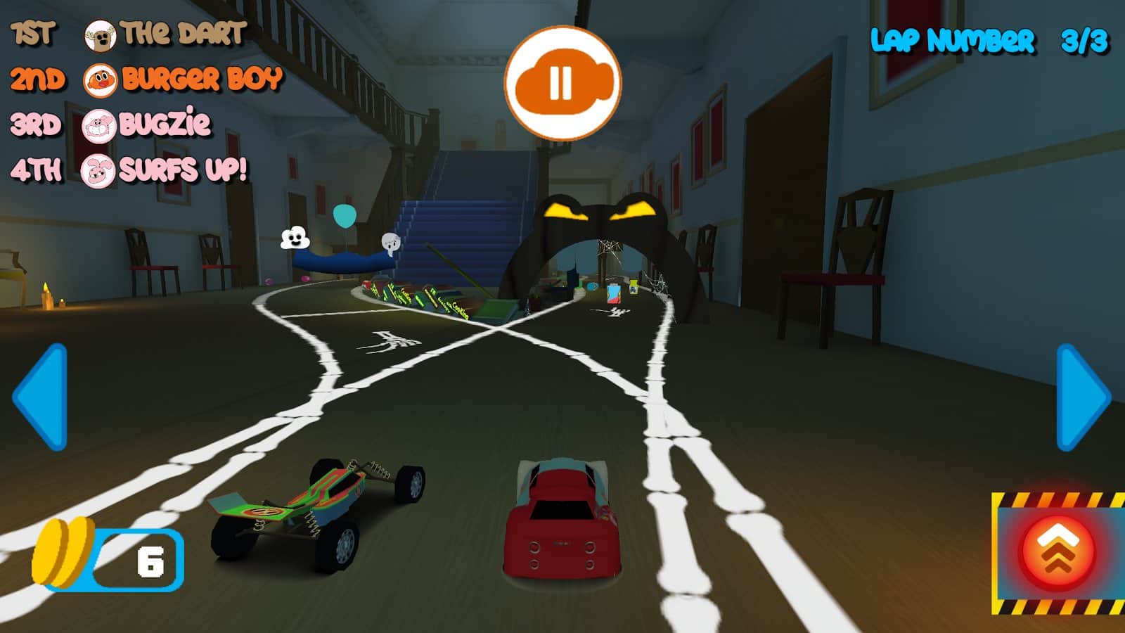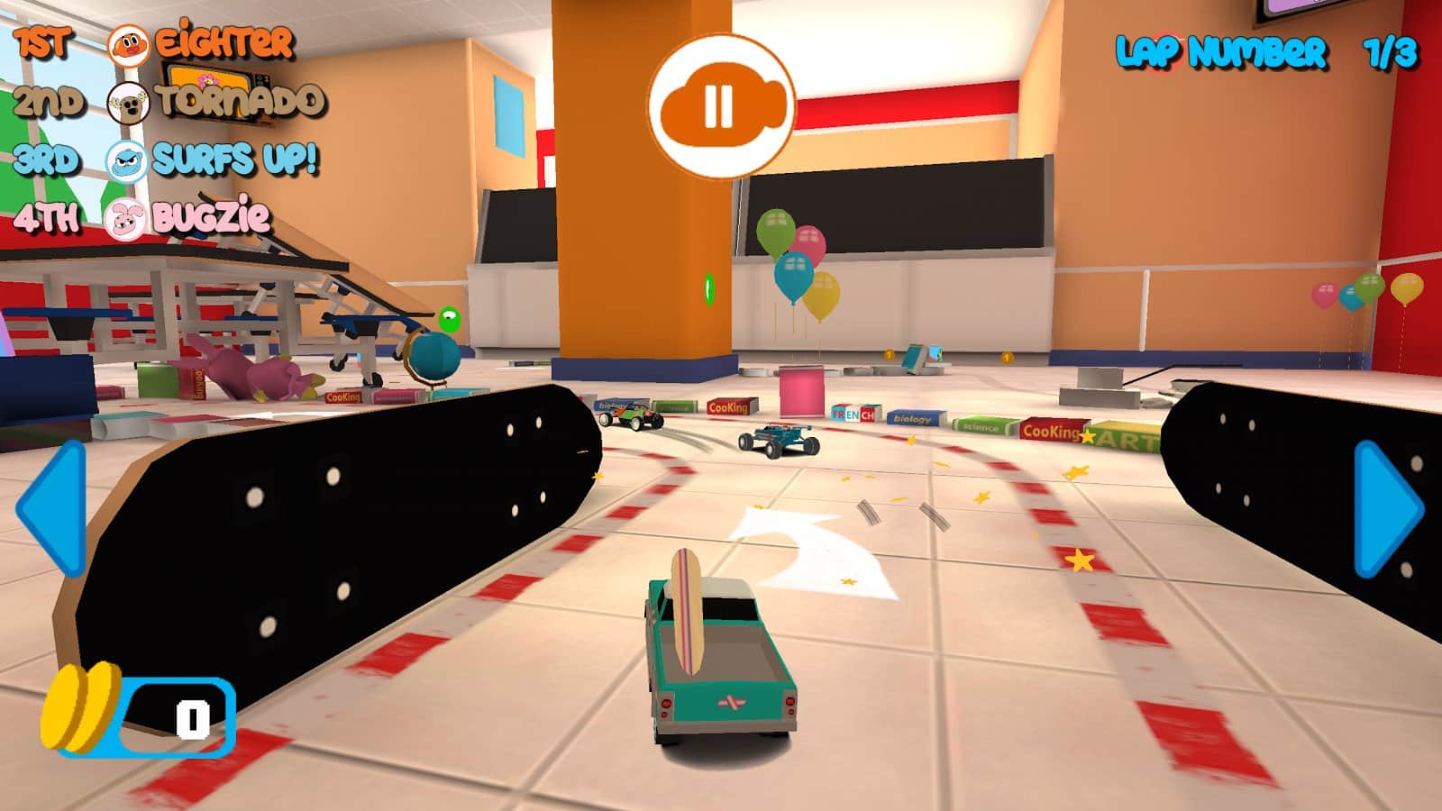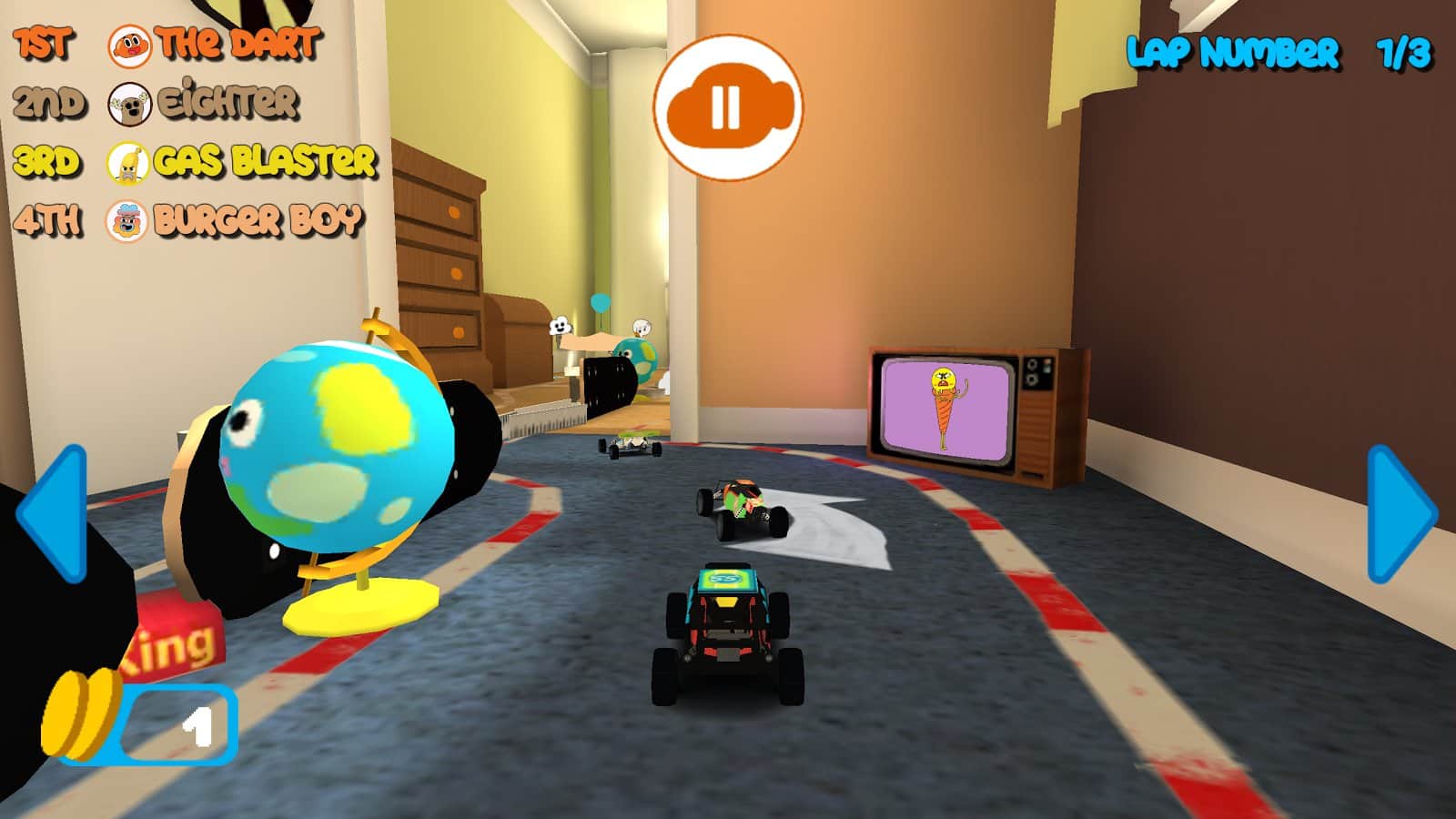 Gumball Racing – в этой игре вы примите свое участие в различных гонках, проходящих на игрушечных машинах. Выбирайте себе машину из многочисленных представленных в игре и управляйте главными героями игры, таким как Габмол или Дарвин. Ведите свой автомобиль по различным трассам, проходящим в разных комнатах дома. Давите на педаль газа до упора и обгоняйте своих соперников, приходя к финишу первым. По пути своего следования не забывайте собирать многочисленные бонусы и обходить преграды, проделывая невероятные трюки.