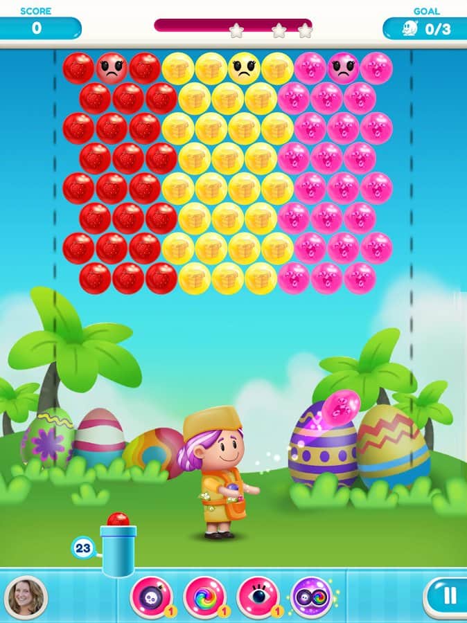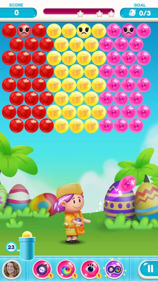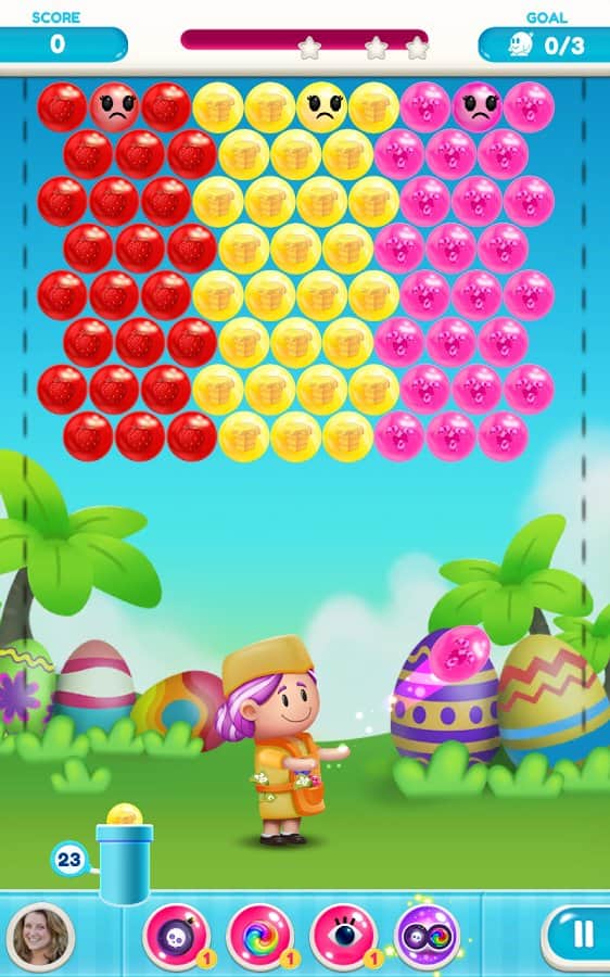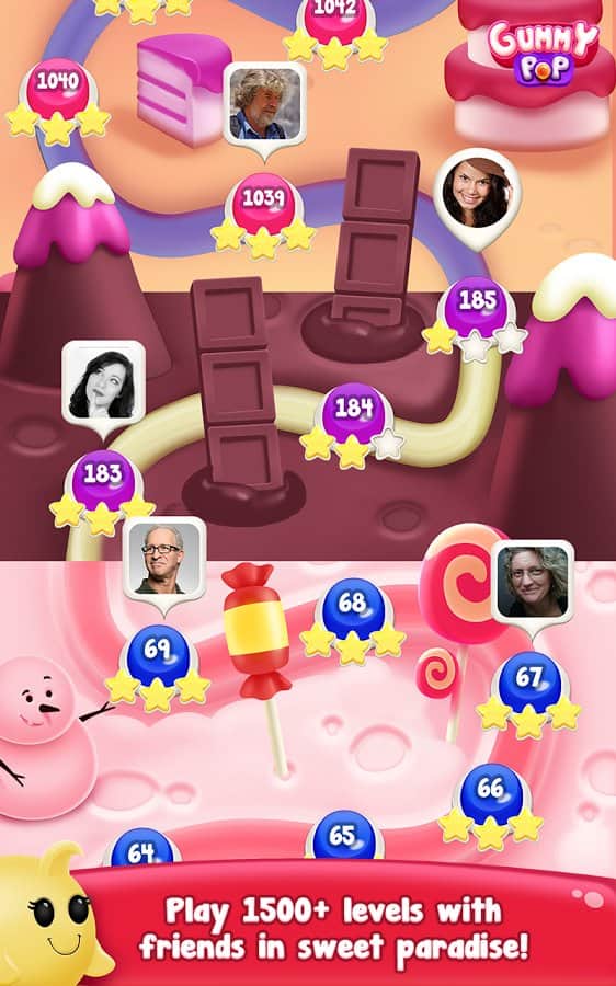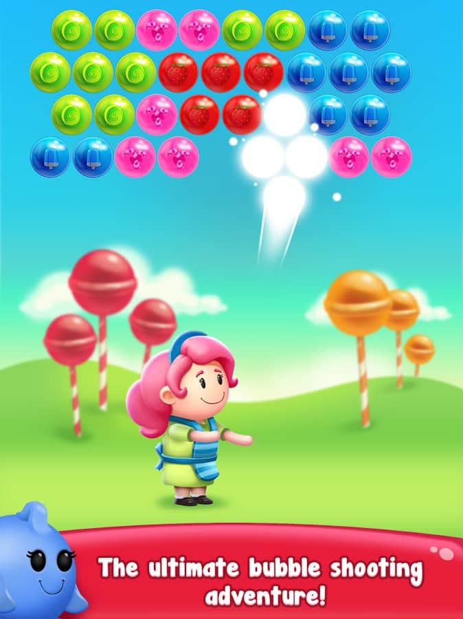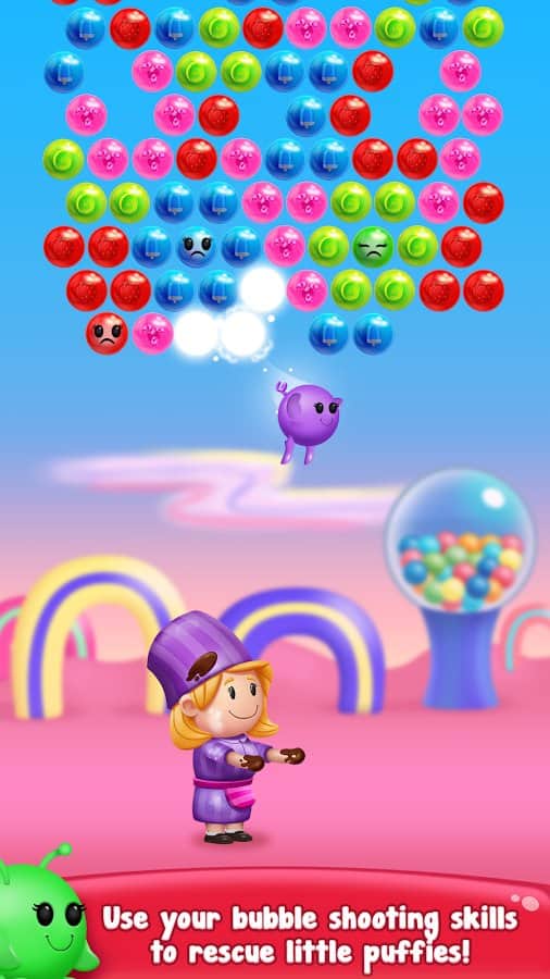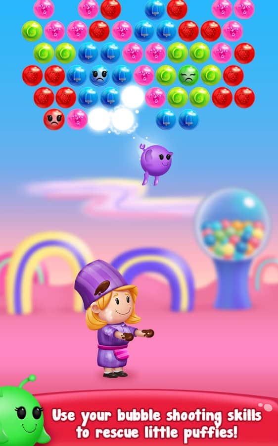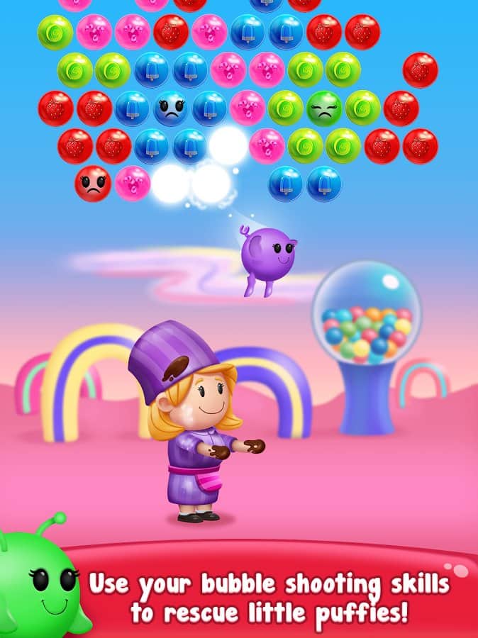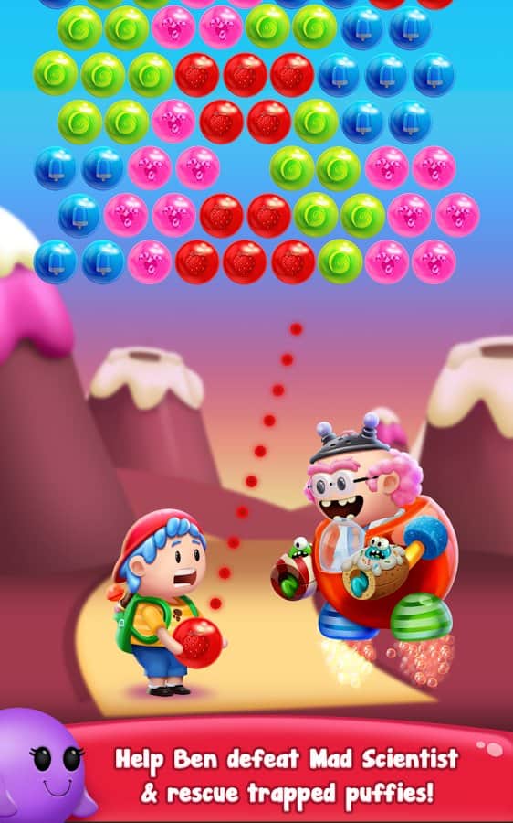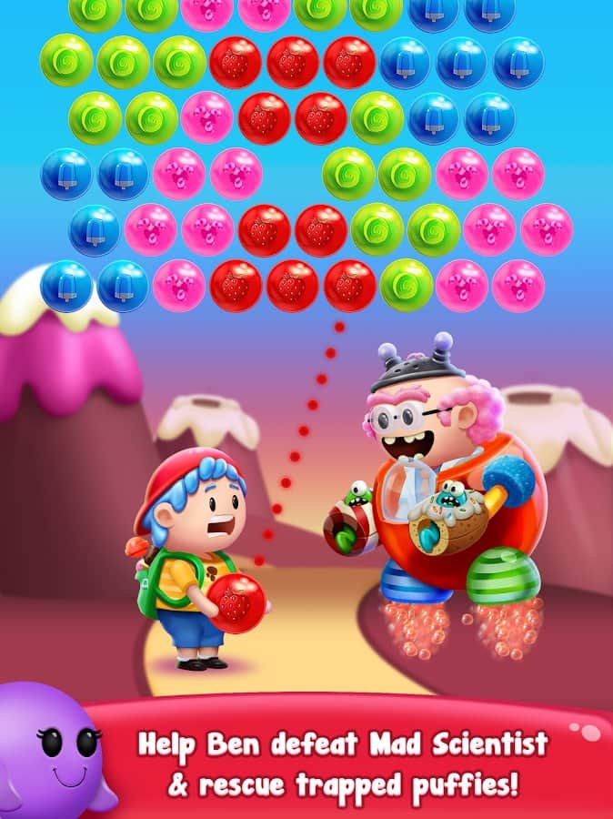 Gummy Pop – увлекательная игра на андроид, где вы будете стрелять разноцветными пузырями. В этой игре вашей задачей будет взорвать все пузыри находящиеся в верхней части экрана и одолеть злого ученого. Составляйте группы из трех и более пузырей и взрывайте их. Старайтесь запустить цепную реакцию взрывов и тем самым уничтожить как можно больше разноцветных пузырей. Применяйте различные бонусы и усиления, которые помогут вам быстрее пройти уровни и заработать как можно больше очков. Всего в игре представлено 1500 уровней, отличная графика и различные персонажи.