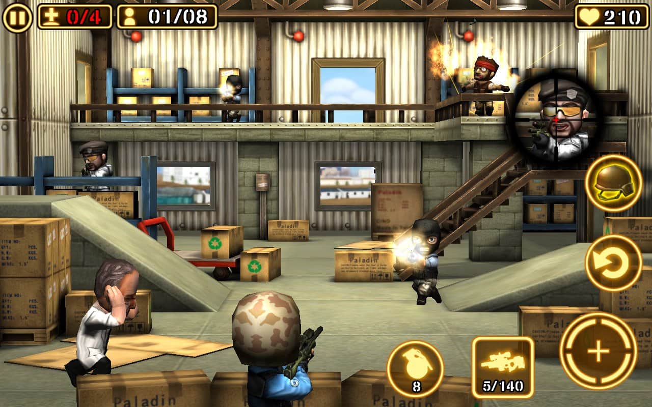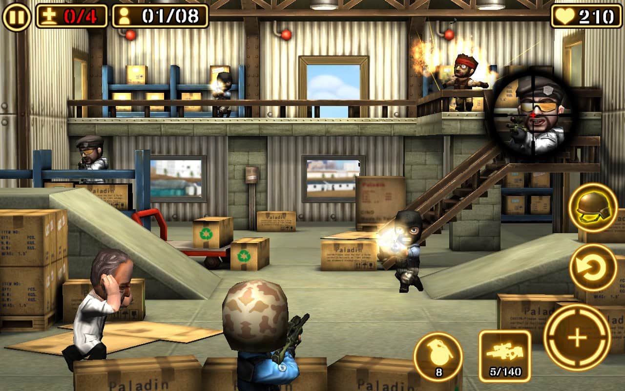 Gun Strike 2 - эта игра на андроид представляет собой интересный тир, в котором мы будем убивать террористов различных мастей. Под перекрёстный огонь могут попасть и обычные граждане, так что смотрите стреляйте точно и не попадайте в простых прохожих. Вас ждёт большое разнообразие оружия, которое кстати можно модернизировать, увеличивать его огневую мощь. Гранаты тоже в ходу, при правильном использовании можно убить сразу несколько террористов одним взрывом.