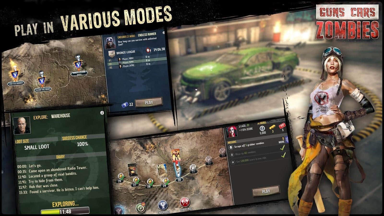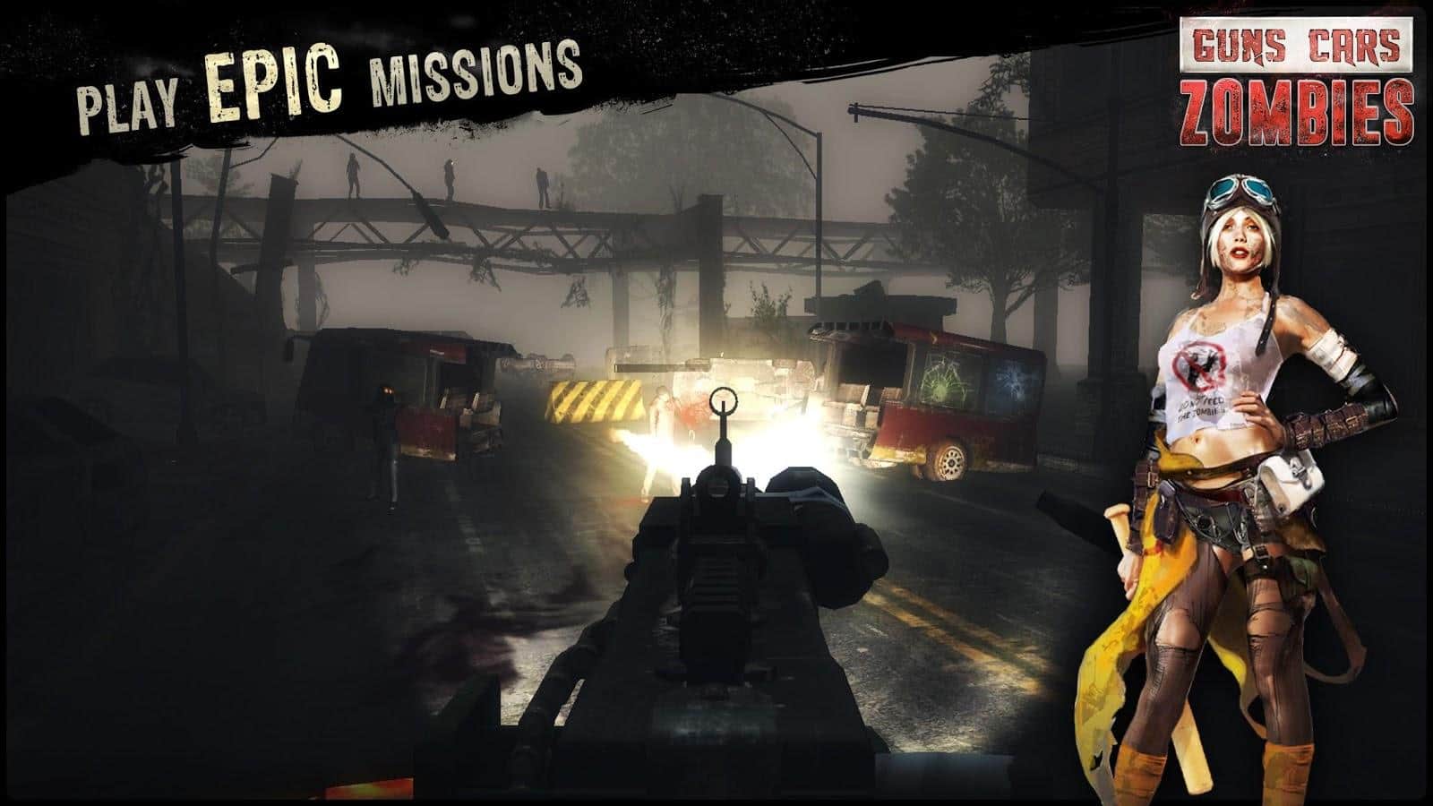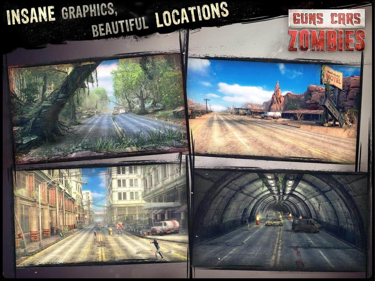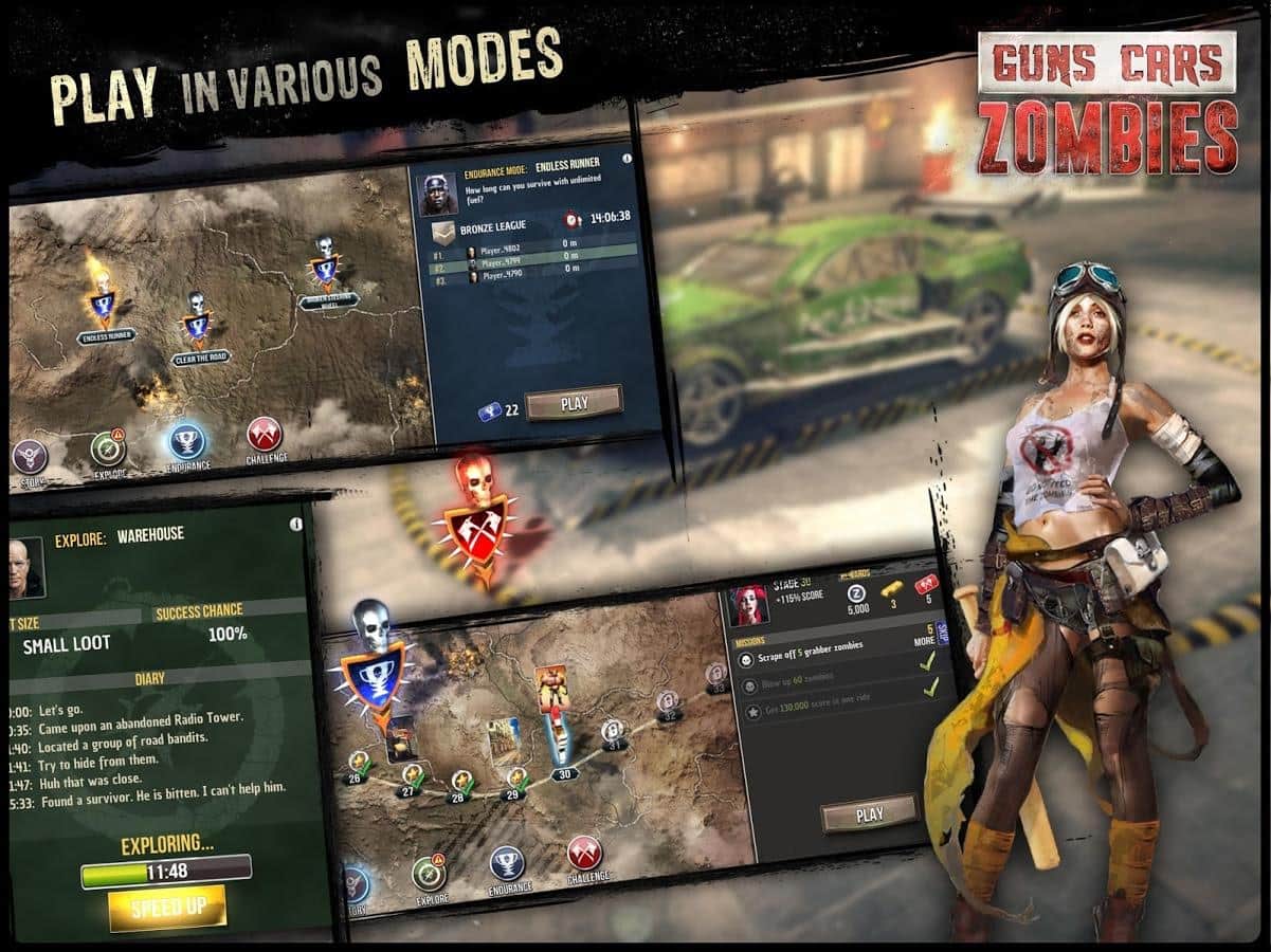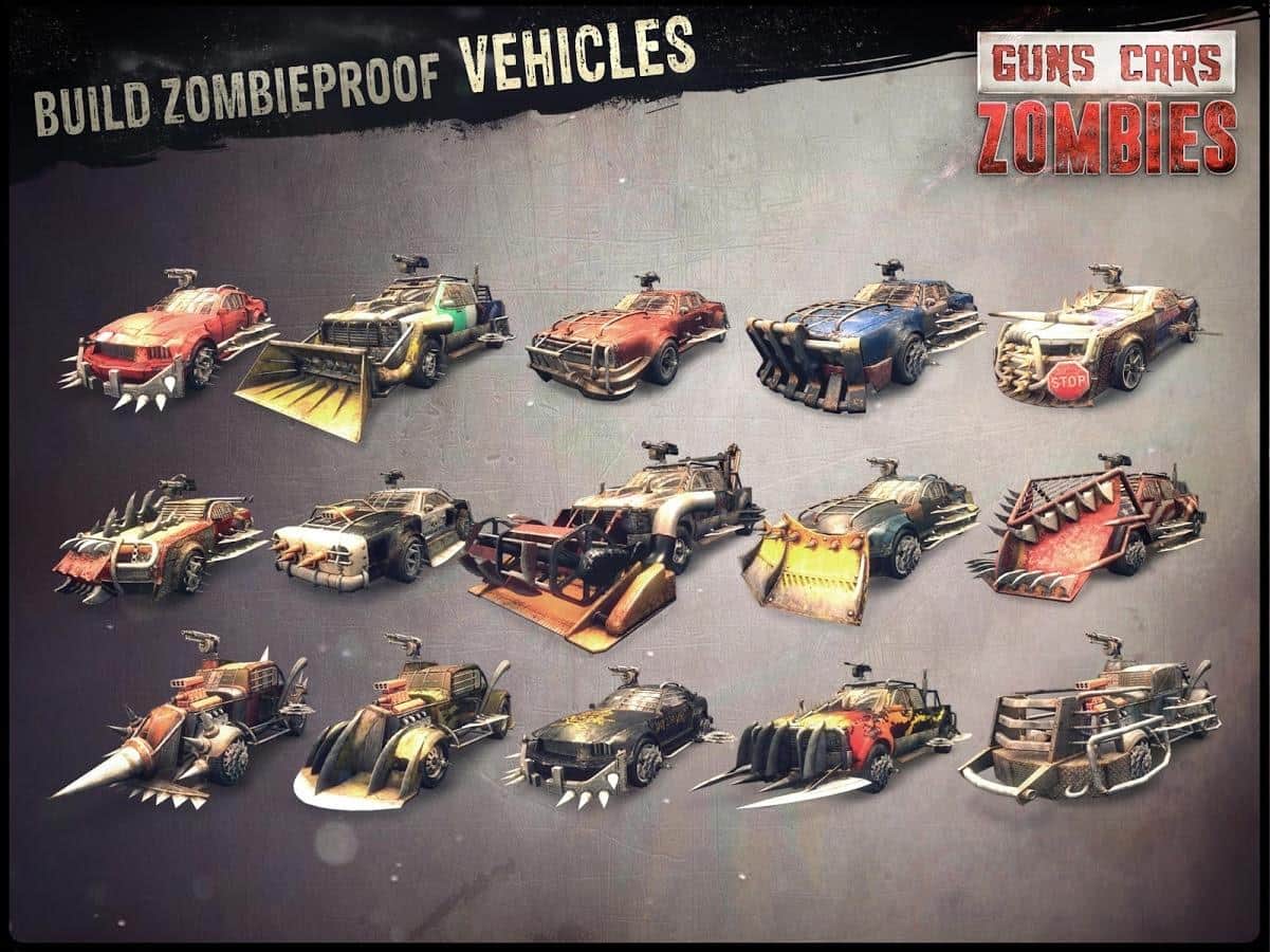 Guns, Cars, Zombies - Оружие, автомобили, зомби и всё это в огромном количестве! Бросайте вызов ходячим мертвецам. В игре вам предстоит гонять на машинах, которые специальным образом подготовлены к тяжелой работе в пост апокалиптическом мире. Ваш автомобиль - ваша крепость – это высказывание будет весьма кстати. Если по каким-то причинам вам этого сделать не получится, тогда вы долго не проживёте. В игре более 150 миссий, которые вы сможете пройти на 5 различных автомобилях, к которым можно докупить более 150 различных навесных частей и это не считая оружия. 4 режима игры не дадут вам заскучать.