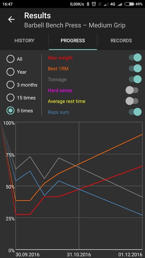 Планирование подходов, вес и повторения, используя результаты предыдущих тренировок (они будут представлены в виде удобных списков и графиков)