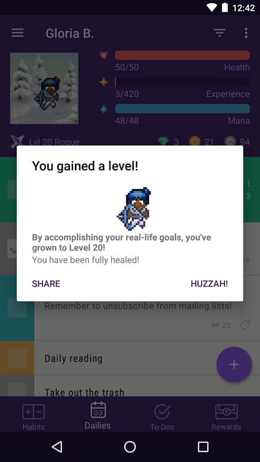 В программе вы ставите себе любые цели, а потом отмечаете их достижение, развивая таким образом своего игрового персонажа и получая награды. Бороться с жизненными трудностями в одиночестве не придется: приложение подразумевает сильный социальный элемент, что сделает ваше самосовершенствование еще интереснее.