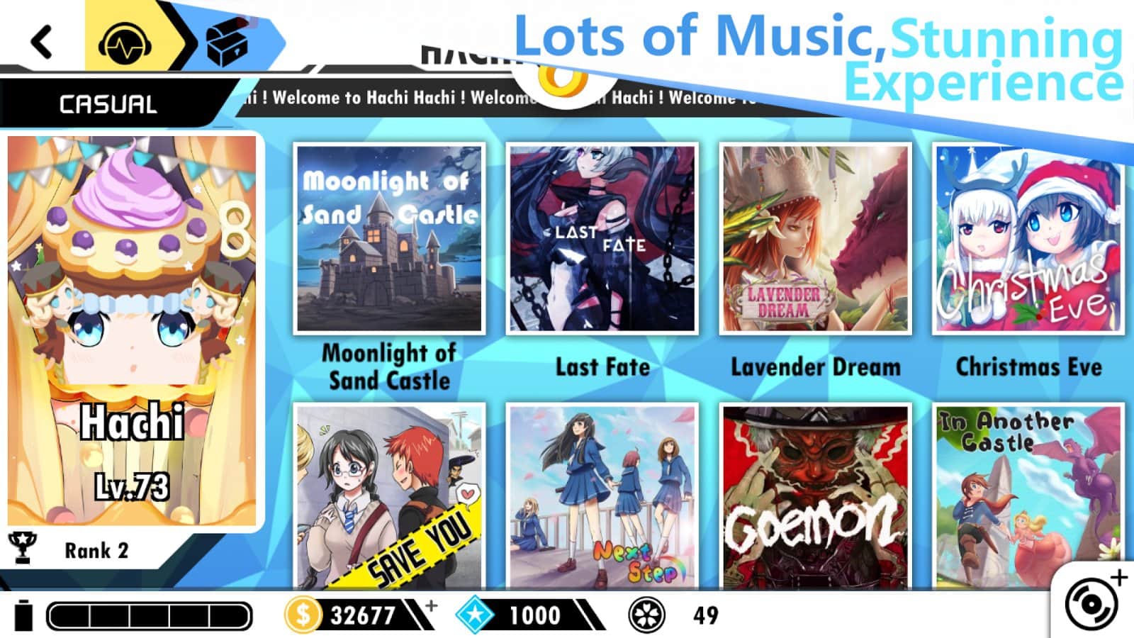 Hachi Hachi – музыкальная игра на андроид, в которую вы сможете играть со своими друзьями или случайными игроками со всего мира. В этой игре вы погрузитесь в мир музыки и будете создавать свои треки, играя в режиме реального времени. Эта игра разделена на несколько частей и каждая имеет свою историю, которая будет раскрываться по ходу игры. В этой игре представлено два режима игры: в первом вы сможете тренировать свои навыки, играя в одиночном режиме, а во втором участвовать в турнире каждую неделю бросая вызов самым сильным игрокам. В игре вы найдете подходящий для себя стиль музыки такие как: J-поп, транс, R & B, хардкор, джаз, и т.д.