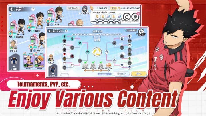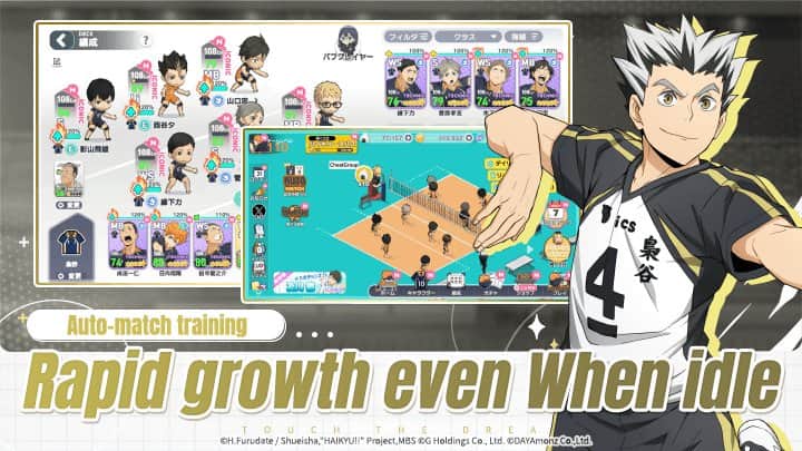 HAIKYU!! TOUCH THE DREAM - Игроки волейбольного клуба объединяются с решимостью и страстью к игре, чтобы преодолевать трудности, развивать свои навыки и добиваться блестящих побед. Познакомьтесь с персонажами из оригинального произведения, включая игроков школ Карасуно, Некома, Аоба Джосай и других. Сформируйте свою идеальную команду и сразитесь с лучшими. Используйте стратегические комбинации навыков и предугадывайте действия соперников, чтобы одержать верх.