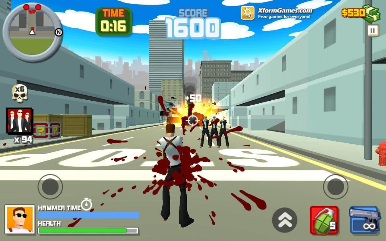 Это самое лучшие что я играл в своём детстве это лучший экшен шутер который я играл ну что из себя представляет данная игра это аркадный экшен шутер от третьего лица где мы играем за безумного мужика под именем хаммер где её главный цель это спасти весь город от агентов в чёрных костюмах и армии (дада я такой рассказчик) теперь мой оценки по игре графика для тех времен она хорошая да конечно сейчас немного устарело но играть можно управление немного неудобно например камеру можно управлять только левым джойстиком но привыкнуть можно оптимизация она просто отличная и почти не лагает на моём телефоне возможно на старых может подлагывать а так это лучший простой но экшен шутер для тех времен который ещё работает на Android 11 всем советую