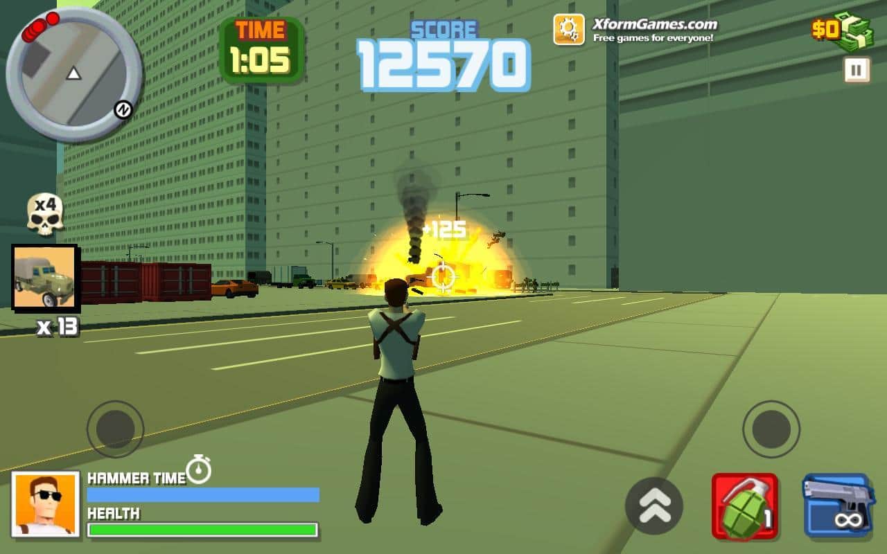 Hammer 2 – экшен на андроид, где вы будете помогать отважному герою, очищать улицы города от плохих парней. Улицы вашего города заполонили враги и плохие парни единственный кто может с ними справиться в одиночку это наш герой Молот. Выполняйте более 30 различных миссии каждая из которых порадует вас новыми врагами и сильными боссами. Уничтожайте врагов с помощью различного оружия, в том числе применяйте взрывчатые вещества. По мере прохождения игры вам будут открываться многочисленные транспортные средства, такие как танки, вертолеты, автомобили, мотоциклы и другие. Получайте многочисленные достижения и соревнуйтесь с друзьями за лучшие результаты. Также не забудьте посетить магазины где вы сможете приобрети уникальные вещи.