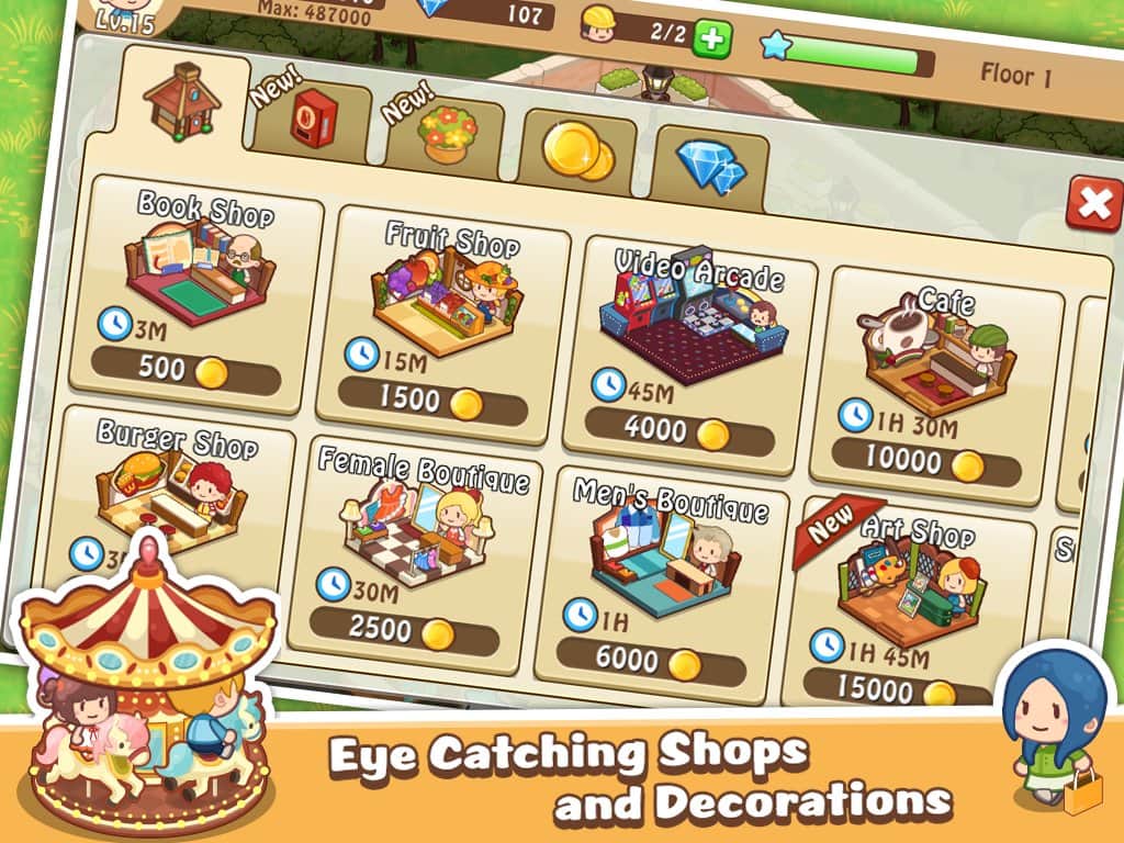 Happy Mall Story: Shopping Sim - отличная стратегия по развитию и улучшению своего торгового центра. Вы стали счастливым обладателем торговых площадей, и теперь чтобы привлечь в них покупателей и инвесторов вам необходимо облагородить и расширить их. Расширяйте свои магазины, привлекая в них более 30 видов различных покупателей, а на собранные деньги обновляйте их. Приглашайте своих друзей к вам в гости, и пусть они оценят ваши магазины по достоинству. Выполняйте ежедневные задания и миссии и получайте за это бонусы и награды.