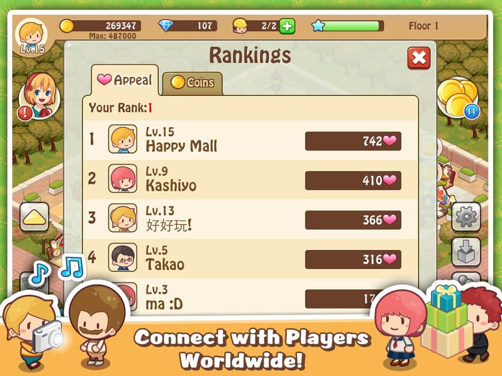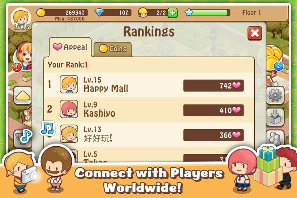 Happy Mall Story: Sim Game - классическая игра из серии TYCOON в которой вам предстоит стать директором небольшого торгового центра, но это для начала, а в перспективе у вас просто неограниченные возможности и все будет зависеть лишь от вашего управления. Разработчики добавили довольно впечатляющие возможности для игроков, в вашем распоряжении будет не только всевозможные украшательства, но и полноценные строительные модели. Расширяйте торговые залы, украшайте их, привлекайте покупателей всевозможными ивентами, другими словами делайте все чтобы ваш магазин превратился в крупный и популярный торговый центр. К тому же разработчики реализовали интересную возможность, все покупатели и продавцы взаимодействуют между собой, что позволит вам своевременно реагировать на их потребности.