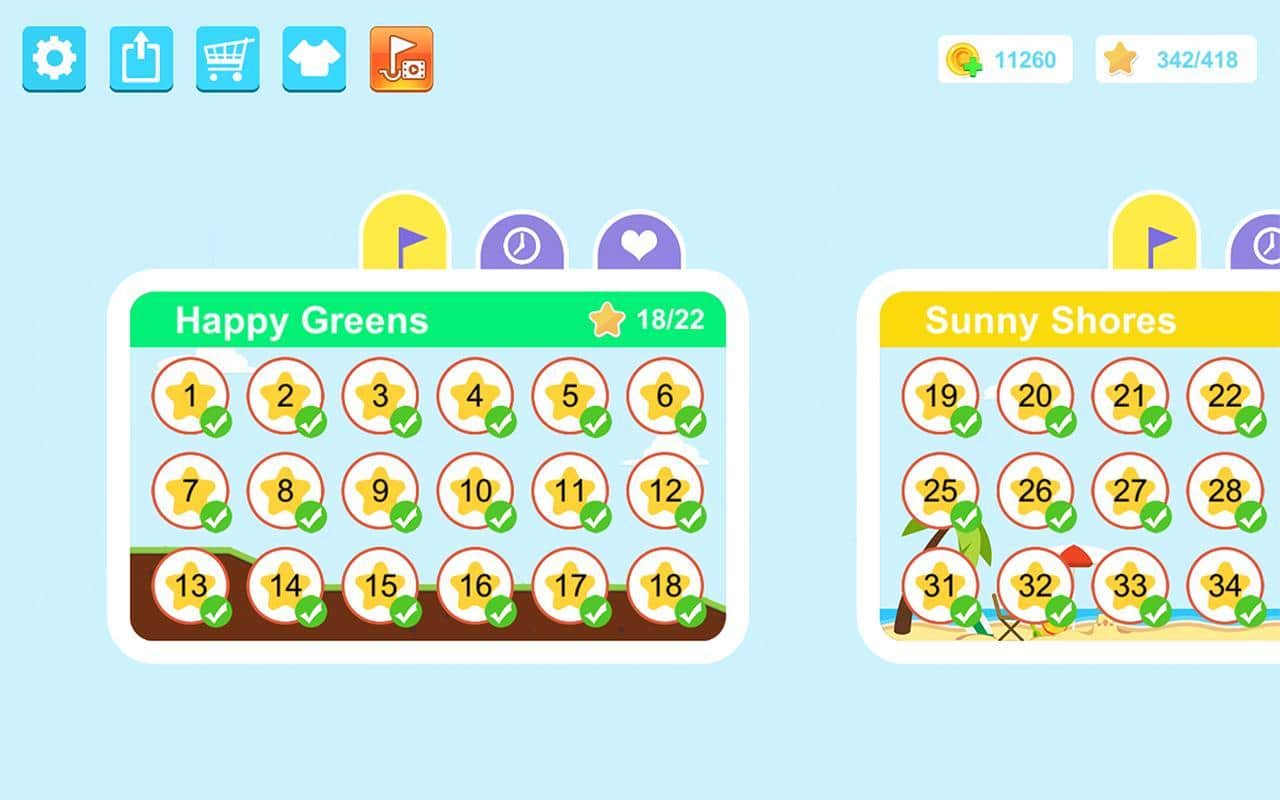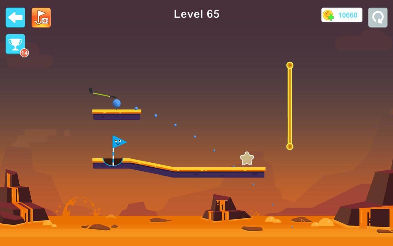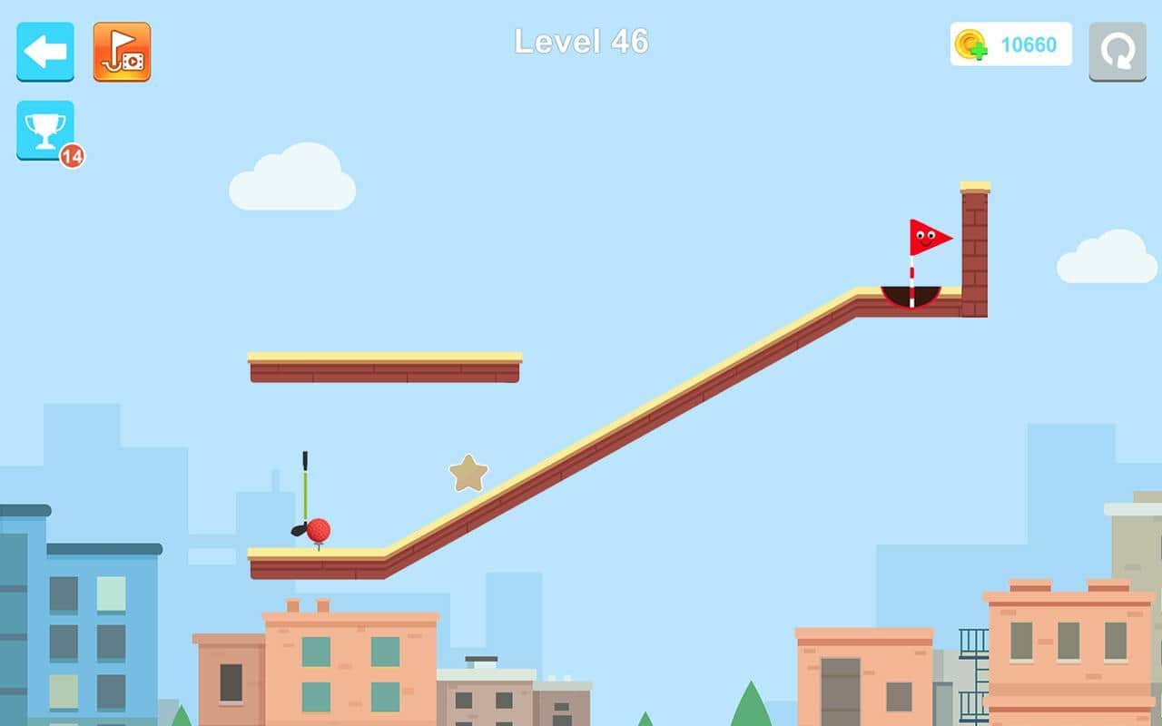 Happy Shots Golf – захватывающий гольф на андроид, где вы будете забрасывать мячик в лунку. Возьмите в руки клюшку и выстраивайте точную траекторию полета мяча чтобы добраться до флажка. Каждый новый уровень игры будет сложнее предыдущего где вам придется использовать подручные предметы такие как люки, кнопки и вентиляторы для того чтобы обойти все преграды на пути и достичь лунки. Положитесь на свою сообразительность и отличную реакцию и проходите один за другим сложные уровни. По пути не забывайте собирать многочисленные звезды и бонусы. Проверьте себя в режиме «выживание» и добейтесь отличных результатов.