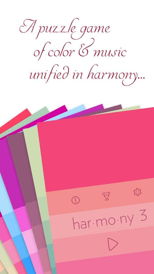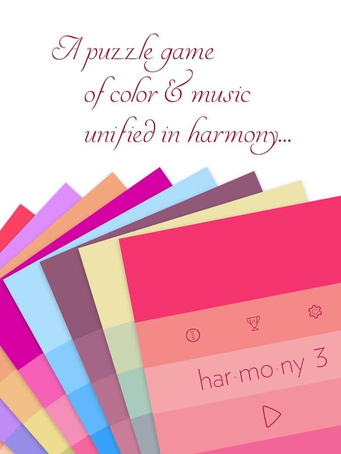har•mo•ny 3 - головоломка выполненная в красивых цветах, приятной музыкой и всё это отлично гармонирует с невероятно увлекательным геймплеем. В игре вас ждёт более 170 изысканных уровня. Каждый из которых может похвастаться своей неповторимой эстетикой. Вам необходимо выстроить блоки так чтобы в итоге получилась цветовая палитра. В начале будет казаться, что игра довольна проста. Однако, спустя несколько уровней, вы поймёте, что с наскока пройти уровень будет крайне сложно. Логичекаяи игр, которая к тому же может ввести вас в полное спокойствие.