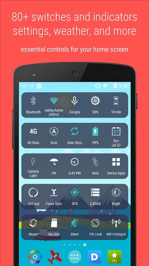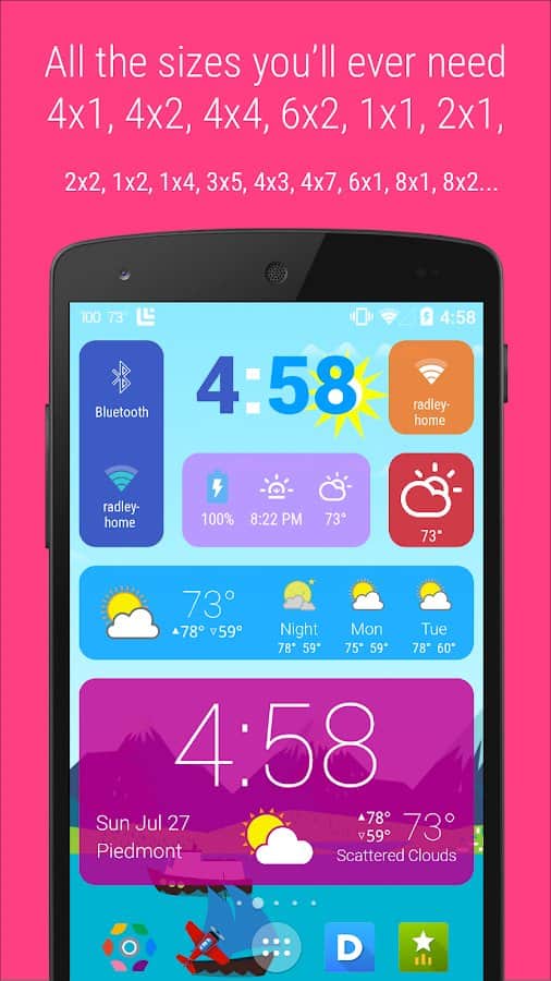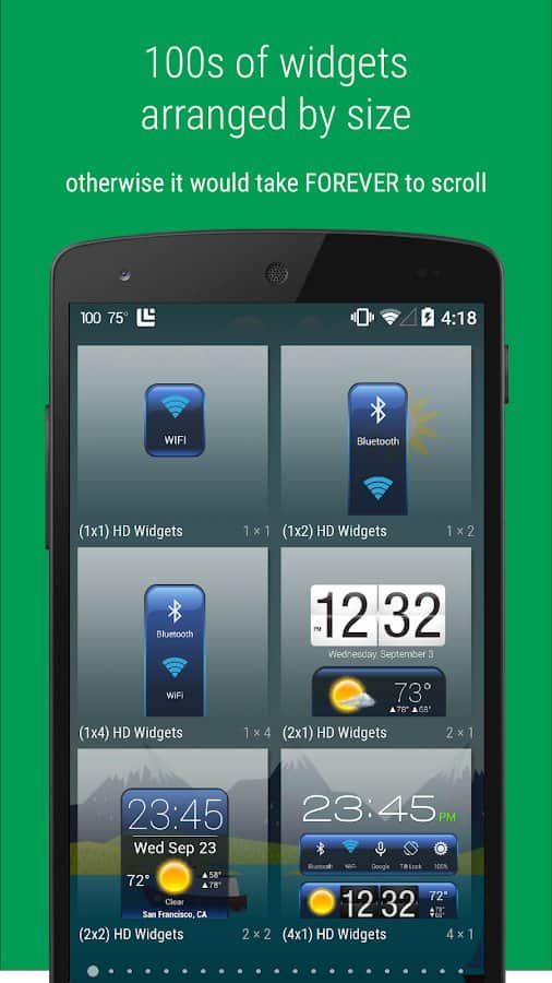 HD Widgets – отличный набор красивых виждетов для андроид, специально разработанных для планшетных компьютеров с высоким разрешением экрана от лучшего разработчика cloud.tv. Приложение содержит десятки отличных виджетов, с возможностью настройки внешнего вида. Из основных параметров можно выделить настройку единицы отображения температуры, интервала обновления данных, метода определения текущего местоположения и многое другое! Просто и эффективно!