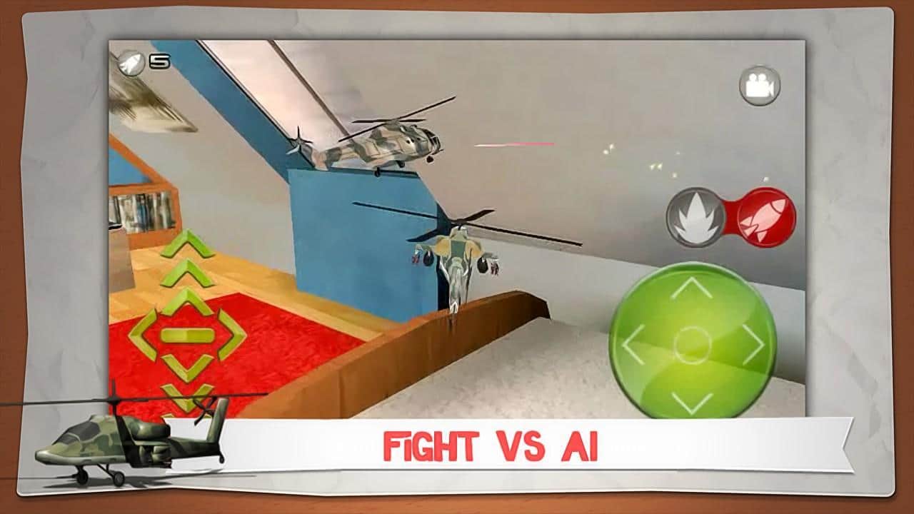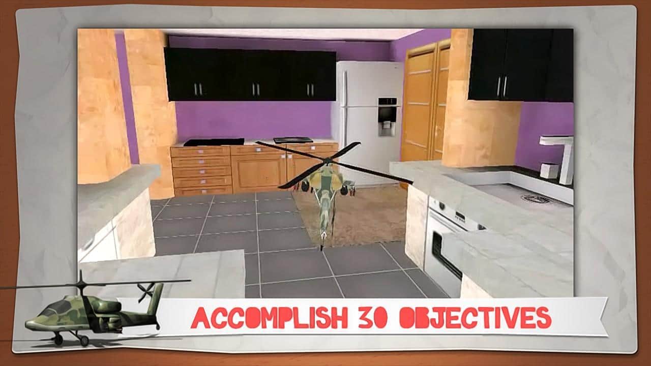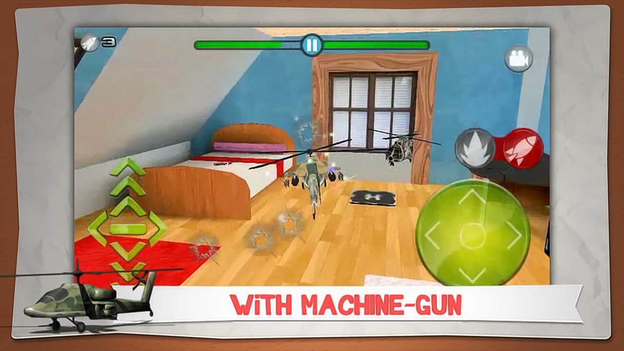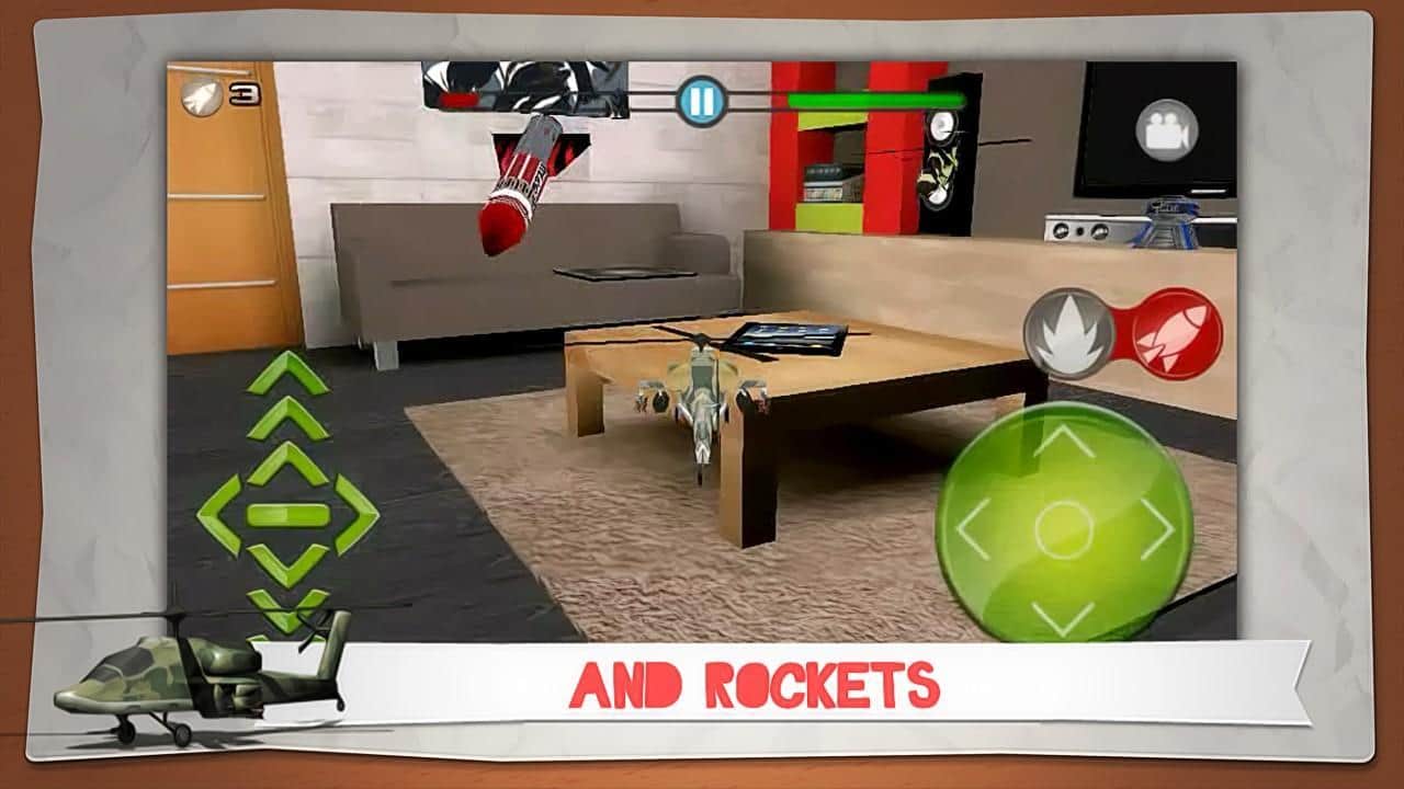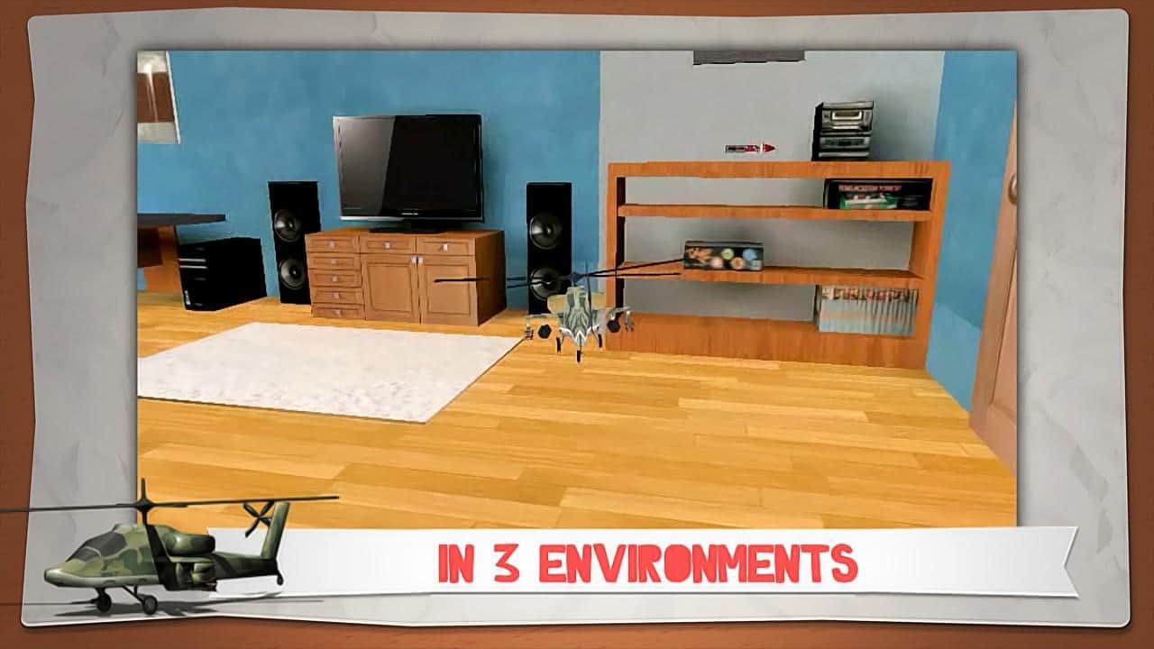 Helidroid Battle: 3D RC Copter - управляйте вертолетом прямо у себя в квартире - как? а очень просто - игрушечный вертолет под вашим чутким руководством выполнит все ваши указания и поставленные задачи. На выбор вам предоставлено 3 модели вертолета - Apache, Comanche, и Puma Super! Ваши локации - это 3 комнаты - кухня, гостиная и спальня. Вы можете лететь в свободном режиме или же в режиме миссий (30 заданий). С каждым уровнем растет сложность и появляются новые элементы. Уничтожьте соперника в честном бою и откройте новые возможности игры!