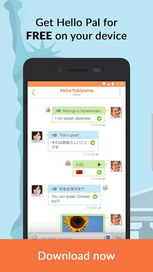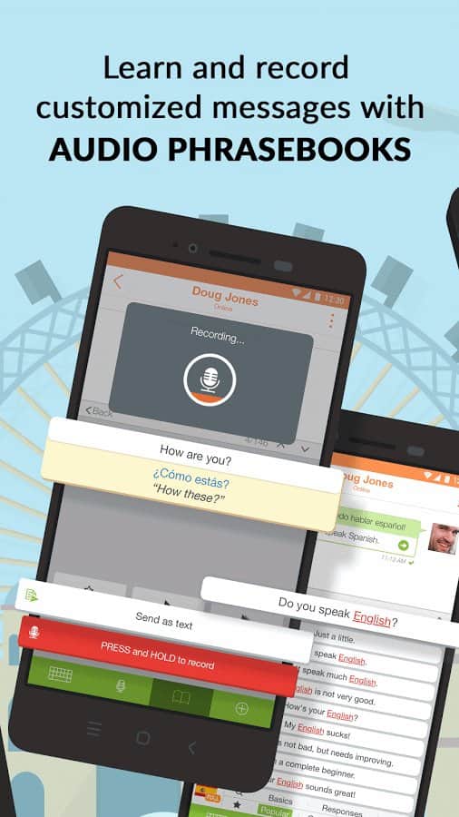 Приложение ориентировано на тех, кто хочет самостоятельно изучать языки, причем не с учителями или учебниками, а с живыми людьми, носителями интересующего языка. В данной программе все это происходит в виде простого чата. Вы пишете сообщение на родном языке, программа переводит на другой и озвучивает перевод, а вы можете отправить и текстовую, и звуковую версию мессежда. Для наилучшего понимания фраз предусмотрен разговорник, в котором собраны основные фразы, которые можно использовать в начале разговора, причем в этом разделе указан как литературный перевод фраз, так и их буквальное значение, что облегчает понимание и изучение языка. На данный момент разговорники есть только для части языков: английского, китайского, японского и французского, а в бета-версии доступны испанский и корейский. Дла работы требуется несложная регистрация, либо же можно войти под существующим аккаунтом Facebook или Google.