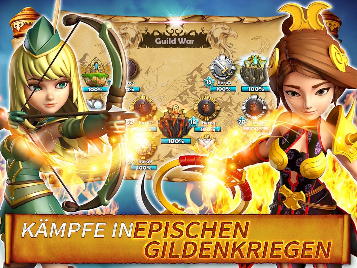 Hero Sky: Epic Guild Wars – стратегия на андроид, в которой вы отправитесь на вершину Олимпа и там будете сражаться настоящими героями и богами. В этой игре вы будете сражаться за право занять трон главного правителя на Олимпе. Выберите себе подходящего героя и погрузитесь в безжалостные битвы нескольких соперников. Постройте свою деревню и усовершенствуйте ее большими крепостями и заборами. Вступайте в могущественные гильдии с другими игроками и помогайте друг другу в массовых боях с врагами подняться как можно выше в рейтинге Небесного мира. Применяйте хитрые приспособления в виде троянского коня для быстрой победы над врагом и нанимайте в свою армию обитателей ада для обороны свое деревни. Сражайтесь и выигрывайте один бой, за другими достигая режима ярости, где ваши войска станут поистине непобедимыми.