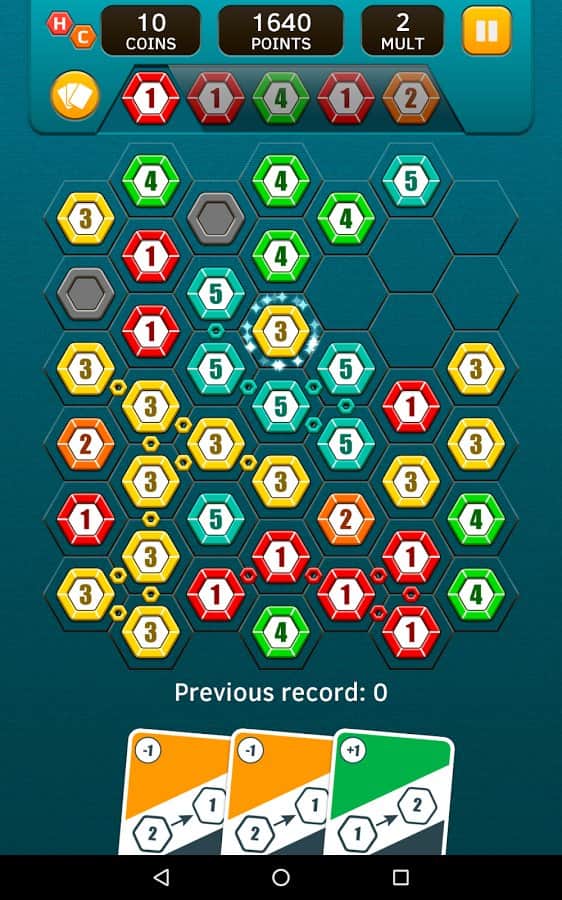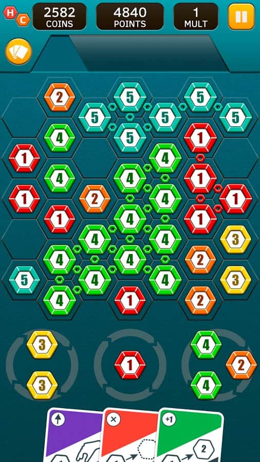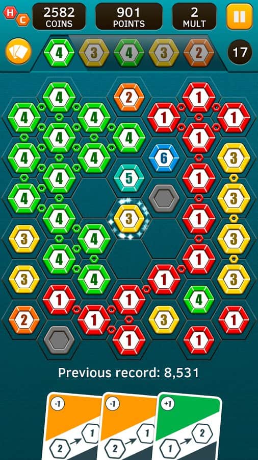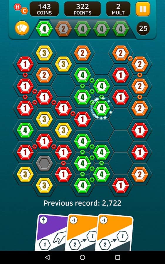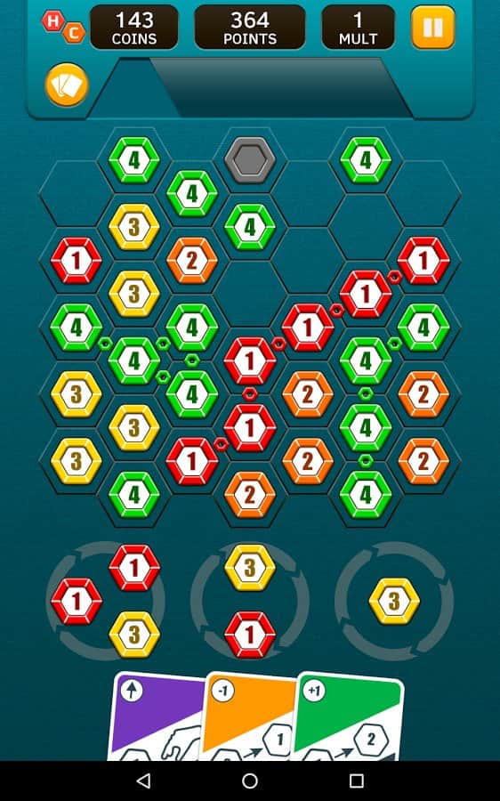 Hex Chains – увлекательная головоломка на андроид, где вы будете перемещать по игровому полю шестиугольники. В этой игре вашей главной задачей будет составлять цепочки из четырех и более фишек одного цвета и убирать их с поля. Применяйте все свои логические и умственные навыки для того чтобы завершить уровень как можно быстрее и заработать максимальное количество очков. Применяйте в игре специальные карты, которые помогут вам убрать с поля не нужные фишки, преобразовать их в другие или поменять их местами. Набирайте очки и тратьте их на покупку различных улучшений. Игра порадует игроков минималистичной графикой, двумя режимами игры и многочисленными бонусами и усилениями.