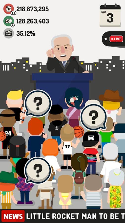 Hey! Mr. President - 2020 Election Simulator – симулятор на андроид, где вы примите участие в президентской гонке. Отправляйтесь в увлекательное путешествие на президентские выборы 2020 и приведите своего кандидата к победе. У вас осталось совсем мало времени до великого дня так что некогда отдыхать и расслабляться. Примите участие в напряженной борьбе и выберите себе кандидата, за которого вы будете играть и добейтесь отличных результатов. Помогайте кандидатам ездить с выступлениями в разные города и вырвите победу у соперника. Играйте в эту игру в любое свободное время и празднуйте победу прямо сейчас.