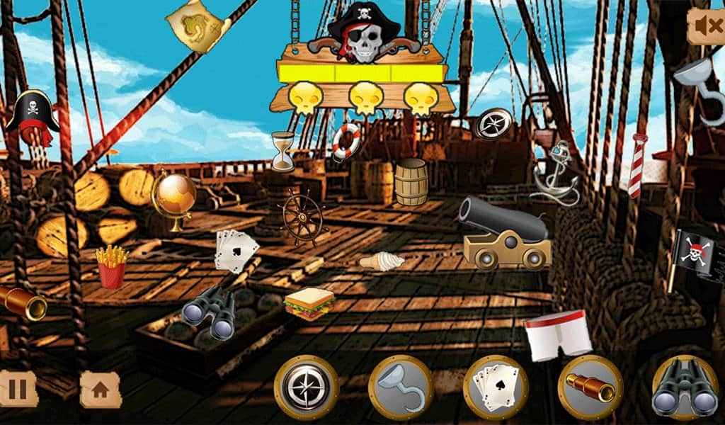 Hidden Objects Pirate Treasure - Отличная головоломка на андроид в стиле Поиска предметов. Игра выпущена в основном для детского возраста. Именно поэтому элементы поиска имеют крупный размер и спрятаны на уровнях очень плохо. На каждом уровне всего двадцать предметов для поиска. После этого вы переходите на следующий уровень. Но на каждой карте вы должны искать те предметы, которые находятся внизу в таблице. Просто так тыкать по всем объектам не получится. Игра оформлена в пиратском стиле, а ваш главный герой – капитан пиратов. Всего в игре семь карт, но объекты поиска постоянно меняются, поэтому игра не закончится быстро.