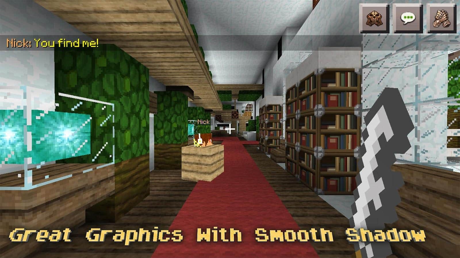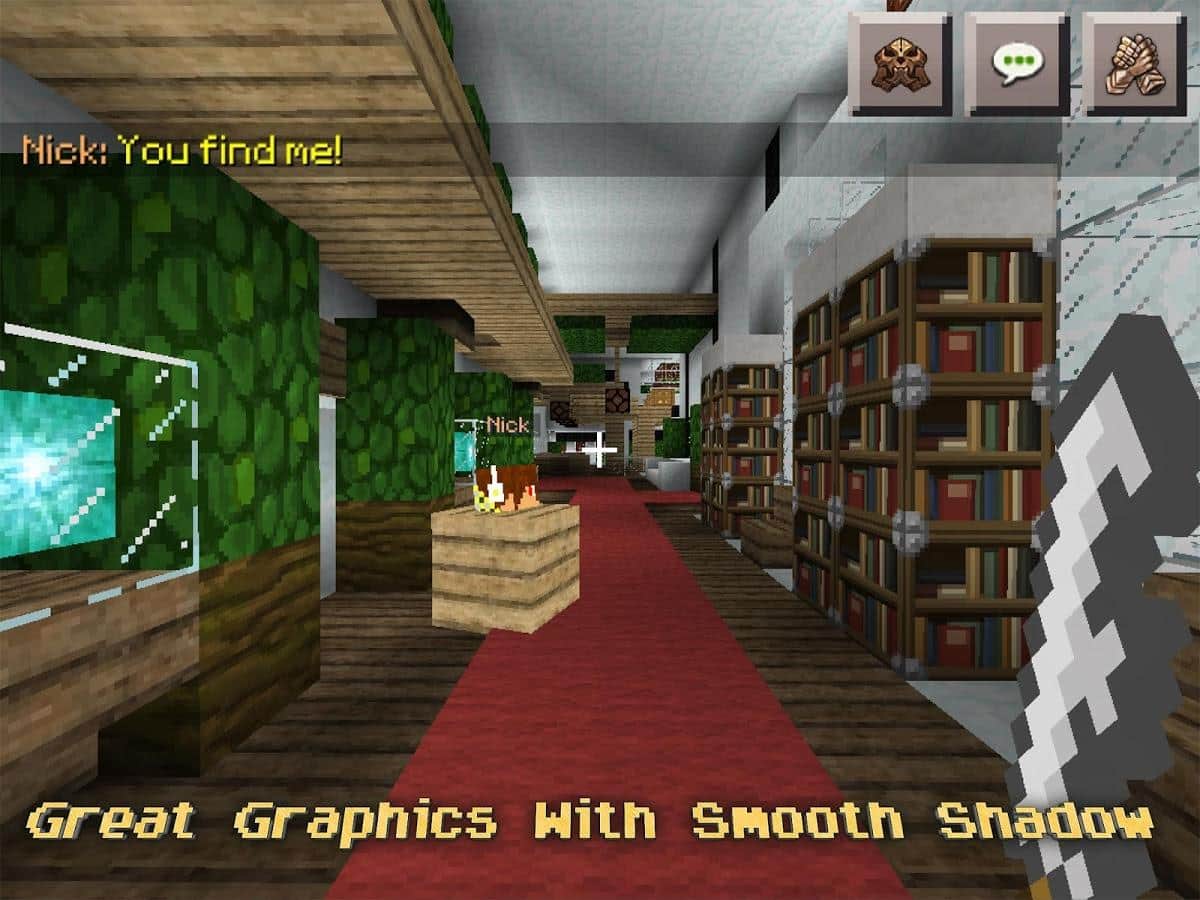Hide N Seek : Mini Game - Эта игра понравиться всем тем кто любит Minecraft и тем кто очень любит прятки! Смысл этой игры в том что вы появляетесь командой с настоящими игроками на одной из множества карт, и потом вас делят. Одна команда будет прятаться а вторая будет искать тех кто спрятался. Для этого у вас будет специальное приспособление, а проще говоря лопата которой нужно будет надавать по лицу убегающему от вас предмету. Да, все те кто прячутся могут превратится в любой предмет на карте и найти их будет непростым делом.