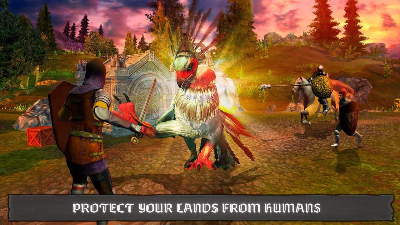 Hippogriff Bird Simulator 3D – игра на андроид, где вы возьмете под свой контроль огромное мифическое существо гиппогрифа. Эта игра погрузит вас в мир средневековья, где вы будете парить над бескрайними полями и сражаться с многочисленными врагами, которые хотят вас уничтожить. Ваш герой будет обладать огромной силой и способен сразится с самым могущественным врагом, используя свои крылья, клюв и когти. Выводите своего героя на охоту и нападайте на дичь и сражайтесь с рыцарями и магами. Выполняйте все миссии предложенные игрой и меняйте внешний вид своего гиппогрифа и развивайте его.