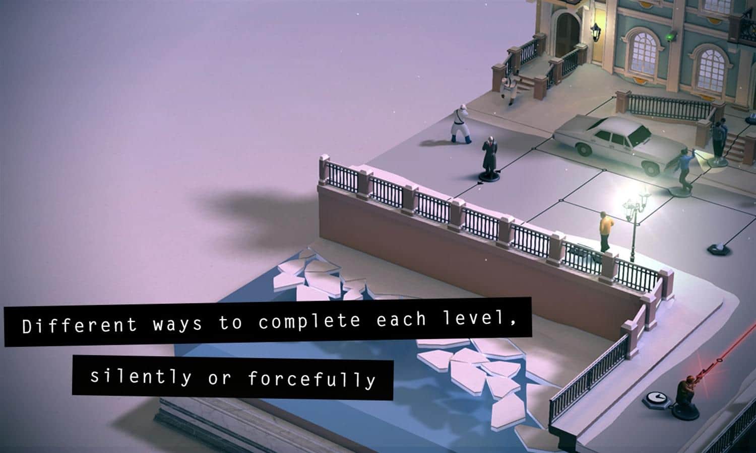 Hitman GO – пошаговая стратегия, в которой вы будете играть за агента 47 которому выпала опасная миссия по уничтожению врагов. Эта игра переместит вас в панорамный мир, где вам предстоит перемещаться по фиксированной сетке, обходя врагов и разрабатывая свою тактику для их уничтожения. Проникайте в хорошо охраняемые места, все ближе подбираясь к цели используя для этого все трюки с маскировкой. Эта игра потребует от вас приложить немало усилий и терпения для того чтобы уничтожить смертельно опасных врагов с помощью различного оружия в том числе знаменитого пистолета Silverballers. Путешествуйте по различным мира и уничтожайте всех врагов стоящих у вас на пути.