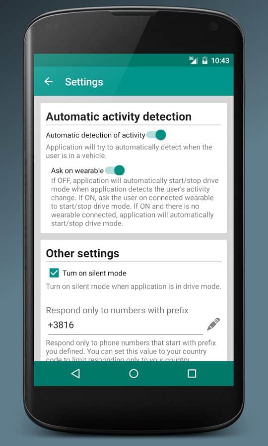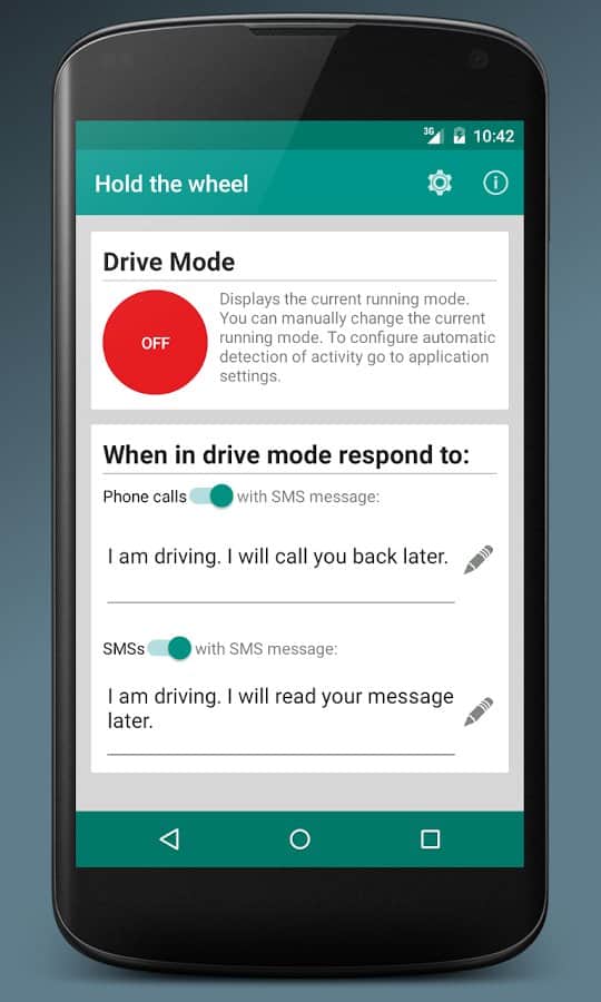 Данное приложение создано для того, чтобы обезопасить своего пользователя во время использования автомобиля. Так, на все входящие вызовы и сообщения программа будет автоматически отправлять SMS по заранее заданному шаблону, а при необходимости просто включать беззвучный режим. Дабы избежать неприятных казусов в виде отправки дорогостоящих сообщений, в программе лучше указать телефонный код своей страны. Активировать Hold the whell можно вручную или оставить это автоматике, которая включит соответствующий режим, опираясь на окружающие условия.