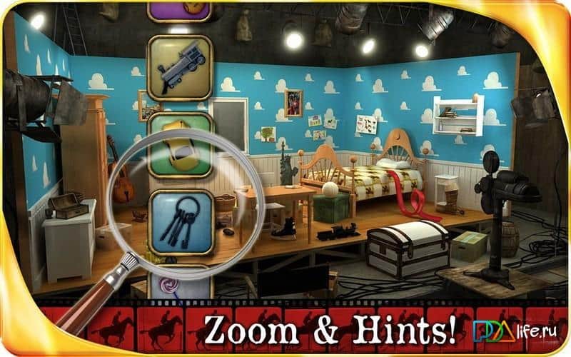Hollywood HD – интересный квест на андроид, в котором вы отправитесь на съёмочную площадку Голливуда. В этой игре вы будете выступать как новый помощник директора, которому во что бы то не стало необходимо доказать что вы хороший работник и достойны этой работы. Вашей задачей буде исследовать различные съемочные площадки и найти там более 23 скрытых предметов, а также узнать название фильма который снимают. Точно разгадывайте название фильмов и их режиссеров и проходите на следующий более сложный уровень. Благодаря зуму вы сможет увеличивать или уменьшать картинку для лучшего рассмотрения, а также использовать подсказки.
