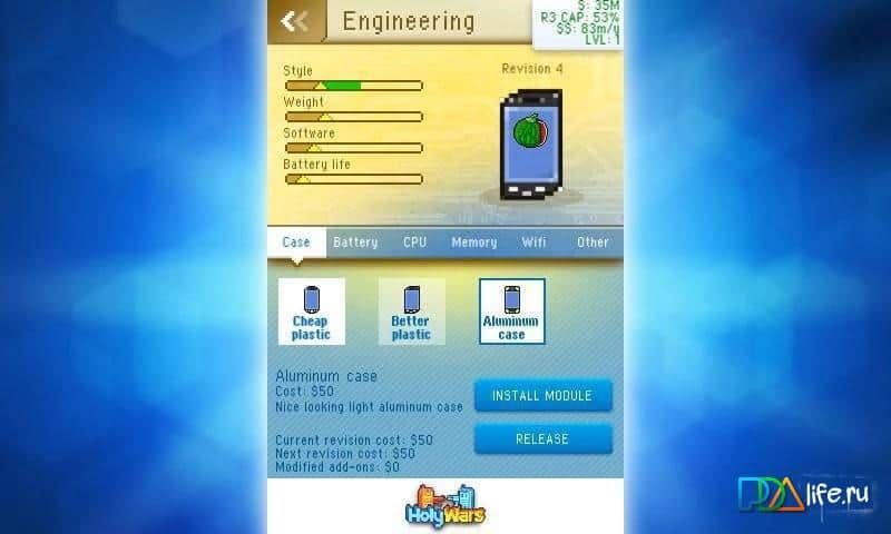 Holy Wars - Футуристическая стратегия на андроид, в которой вам предстоит создавать компанию по производству телефонов. Игра выполнена в пиксельном стиле, напоминающую графику восьми битных приставок. Ваша задача – создавать модели телефонов, делать их модернизацию, и выпускать различные гаджеты.