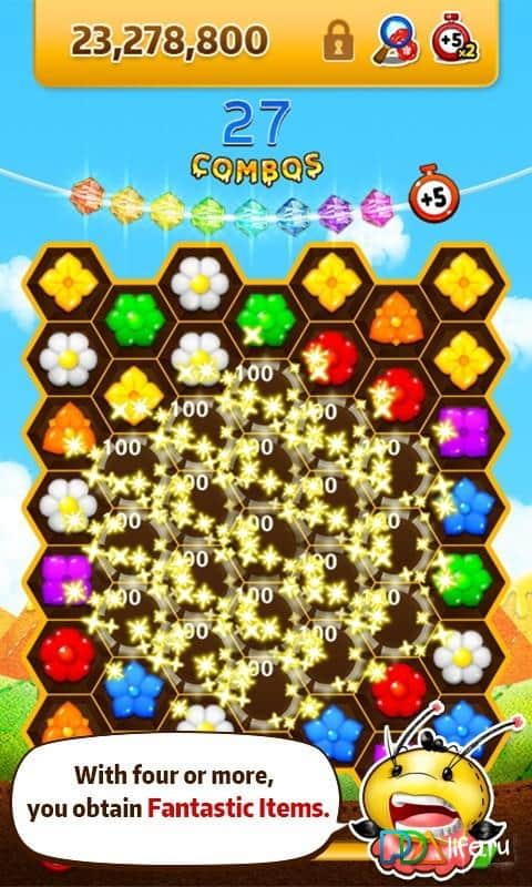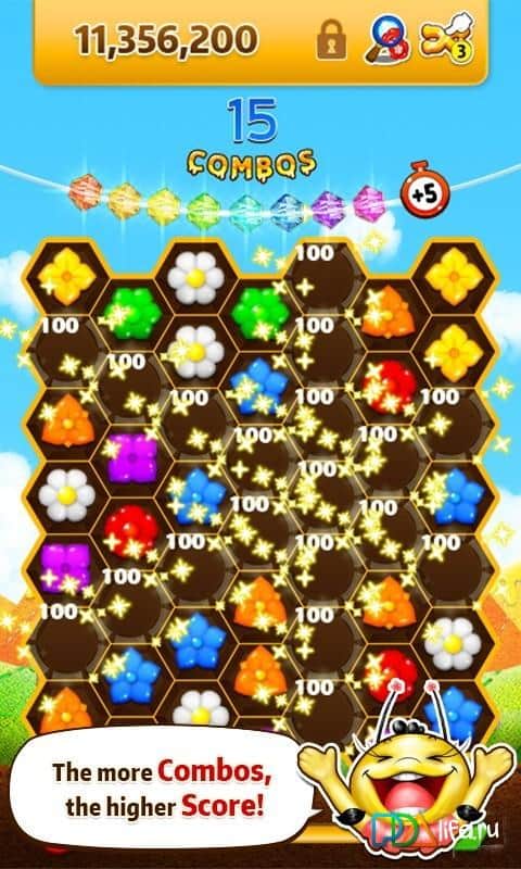 HoneyDay Blitz – игра из жанра «три в ряд» на андроид, где вам предстоит помочь пчелкам собрать как можно больше меда. Составляйте по три и более одинаковых цветка в ряд, меняя их местами, и получайте мед. Чем больше вы составите рядов с цветами, тем больше меда получать пчелки. Прилагайте все свои усилия для того чтобы помочь пчелкам. Проделывайте комбо удары с помощью различных усилений и бонусов и поставьте свой рекорд в этой игре, поднимаясь на самый верх таблицы лидеров. В игре вас ждут не повторяющиеся между собой уровни, оригинальный игровой процесс и мировая таблица рейтинга.