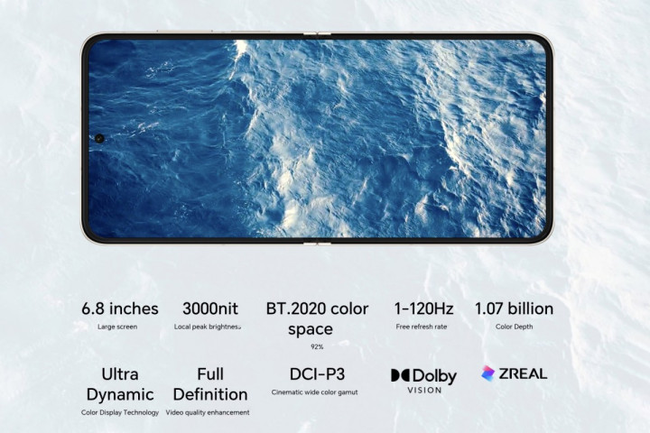 Ключевая деталь в дизайне устройства — крупный внешний дисплей на 4 дюйма с врезанными в него камерами. Яркость OLED-панели 1600 нит, разрешение 1200х1092 пикселей. Диагональ внутреннего экрана 6,8 дюйма. Здесь также используется OLED-панель, но теперь ее разрешение 2520x1080 пикселей, а яркость выросла до 3000 мАч. Сканер отпечатков пальцев располагается на боковой грани.