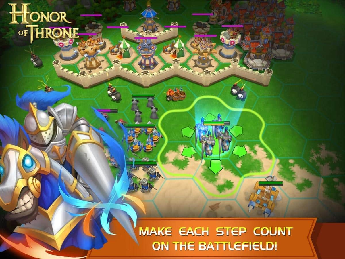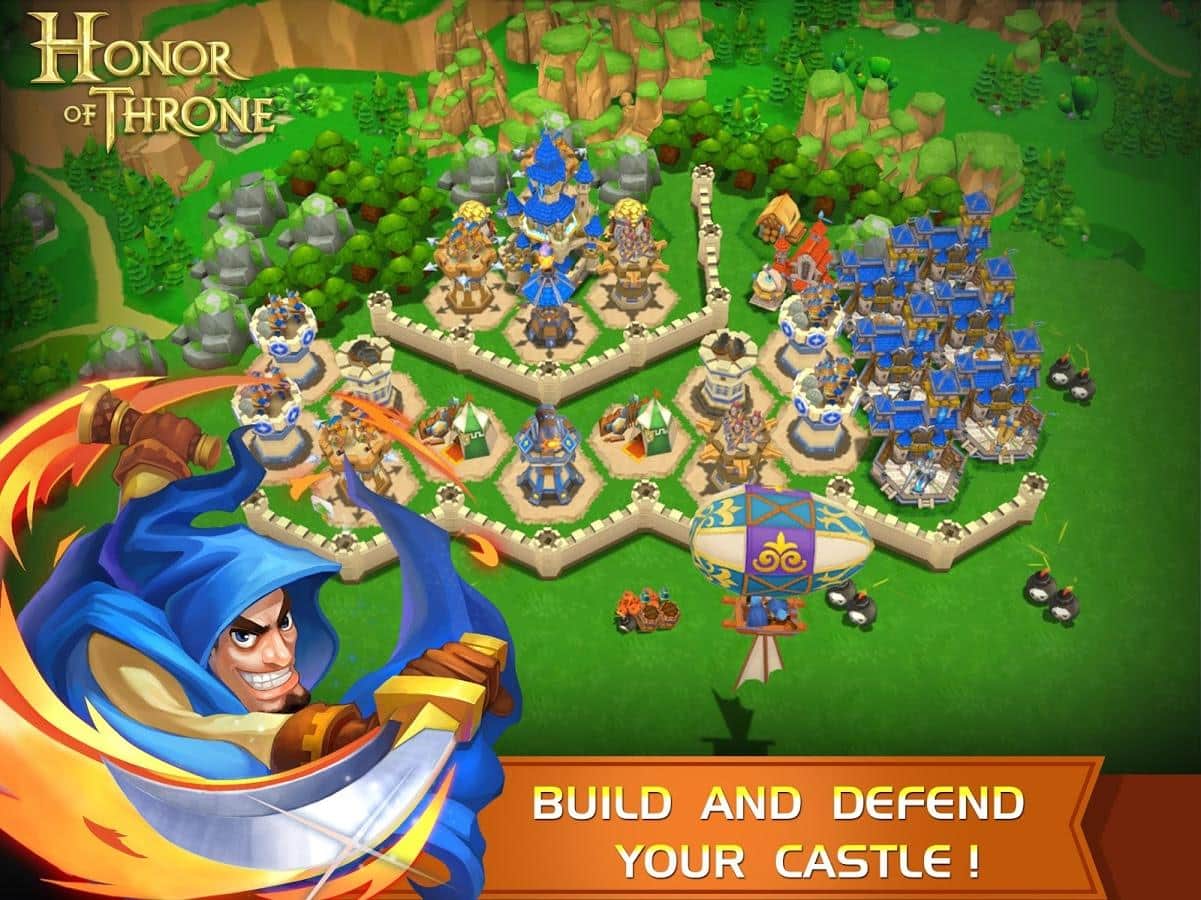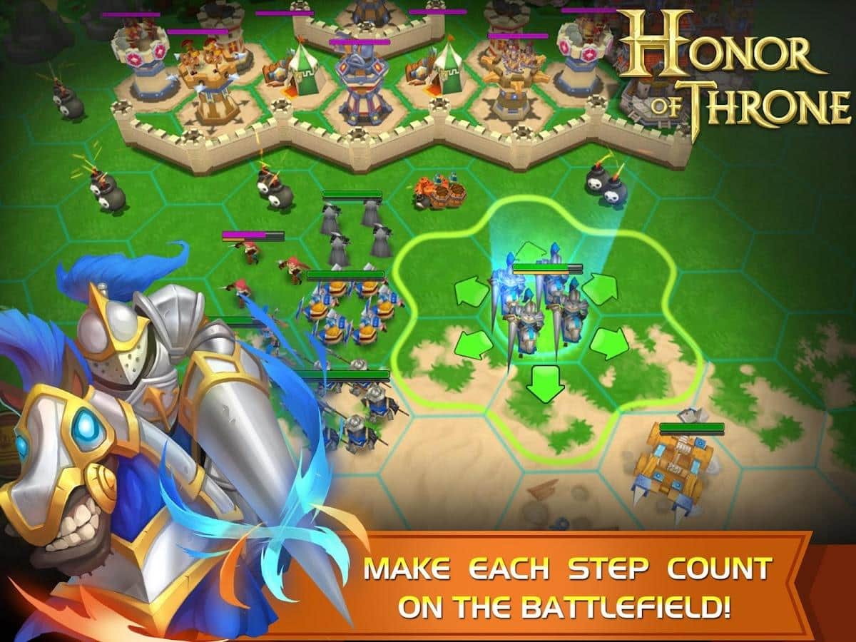 Honor of Throne – стратегическая мобильная игра, в которой отважные герои были втянуты в эпическую и беспощадную войну с тёмными силами.Создайте свой собственный замок, оттачивайте мастерство ваших войск и проводите исследования древних реликвий и неизвестных территорий, чтобы получить честь славу и трон! Стройте свой замок и уничтожайте врагов и зарабатывайте очки чести и ресурсы, за которые можно нанять новых солдат или построить новую инфраструктуру в замке. С помощью воздушного шара можно исследовать новые территории полные невероятных приключений. Пошаговые поединки должны сопровождаться грамотными и тактические выверенными ходами.