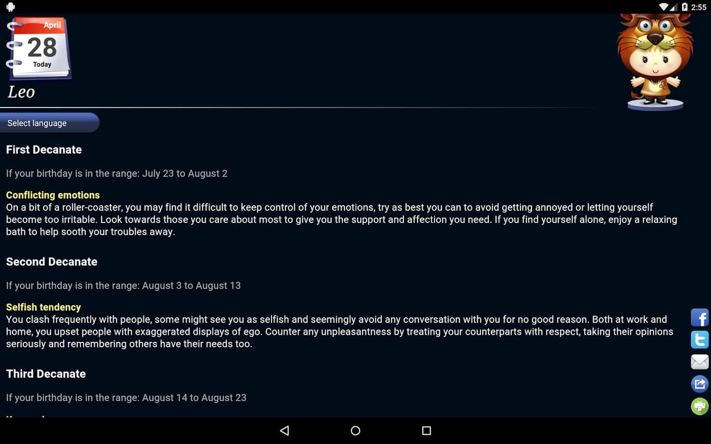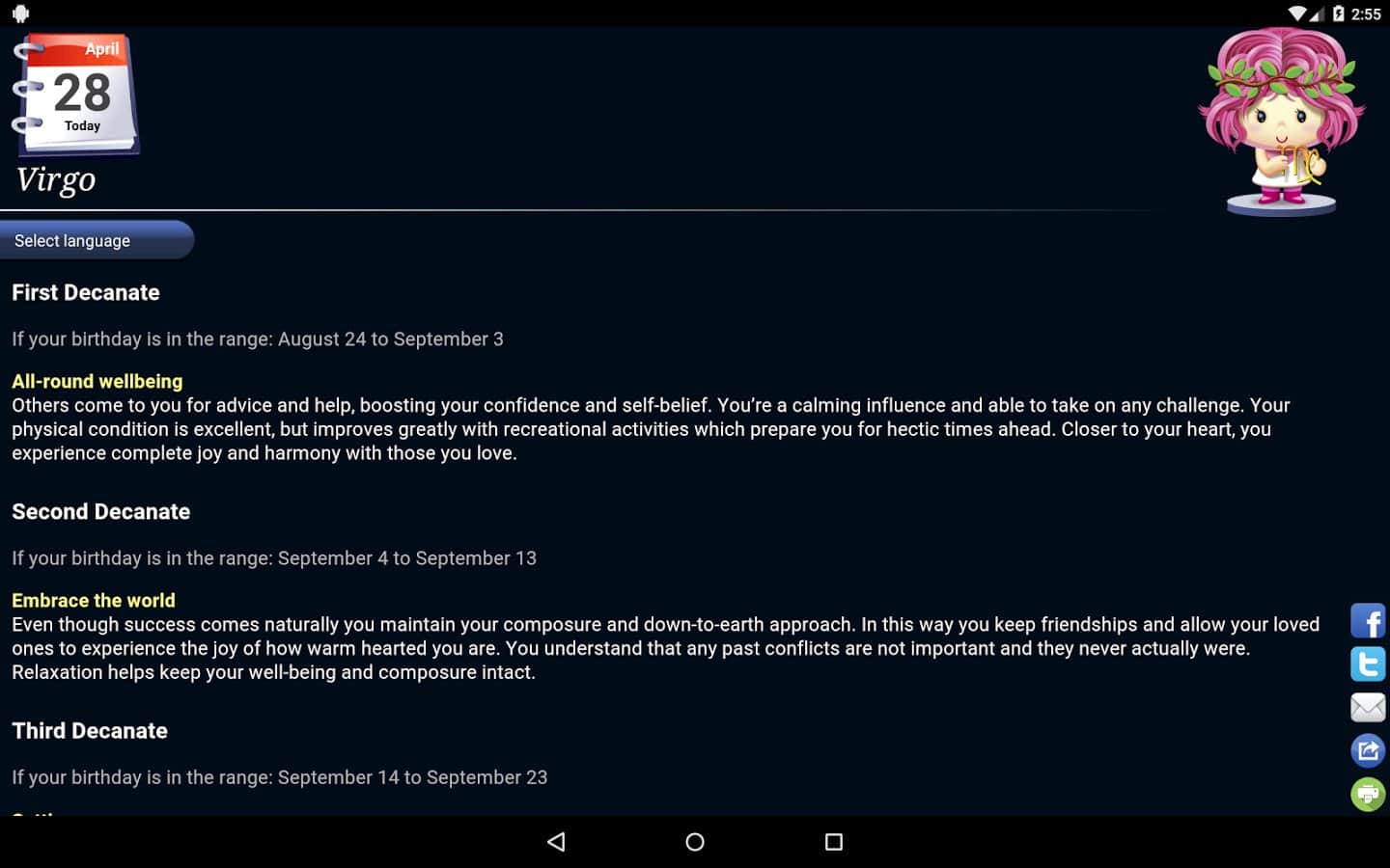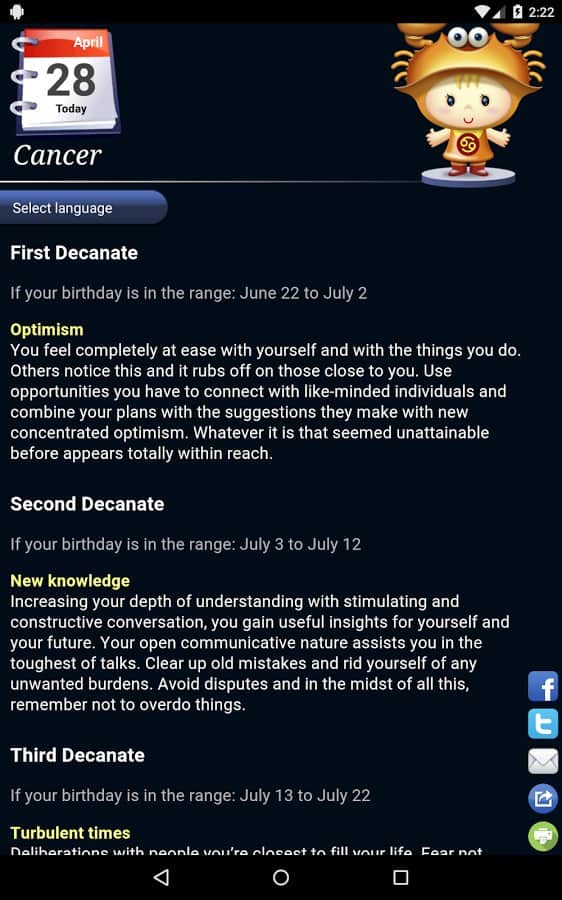 Horoscope HD Pro – замечательное приложение на андроид для любителей знать, что на день им запланировано самой судьбой. Очаровательный гороскоп, с малышами в костюмчиках под знаки Зодиака, который подтвержден швейцарским центром астрологии. Так что все серьезно =), несмотря на оформление.