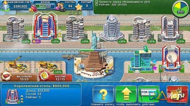 Экономическая стратегия Hotel Mogul / Магнат Отелей в которой вам предстоит построить свой райский уголок. Вам нужно будет построить свои отели для этого вам пригодятся такие возможности, как купля, продажа, покупка земли, улучшение зданий, застройка участков и т.д. И самое главное игра переведена на русский язык что несомненно является главным для стратегий. Так же можно поставить плюс за графику, качественную анимацию и за хорошую озвучку.