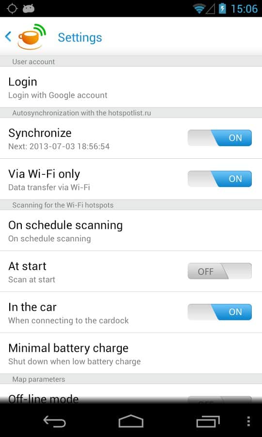 Оффлайн режим работы программы (скачивается карта региона и информация по WiFi точкам в регионе)