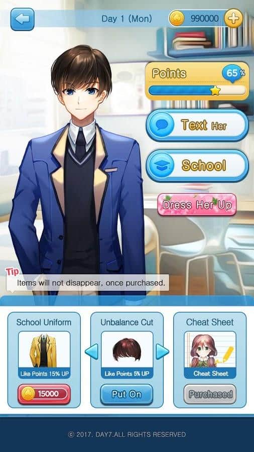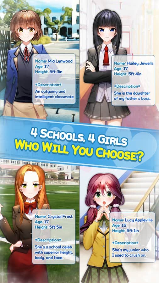 How to Get a Girl in 33 Days – увлекательный симулятор на андроид, где вы будете помогать студентам заводить романтические отношения. Выбирайте себе героя, подбирайте для него подходящий внешний вид и отправляйтесь в школу на занятия, находя себя новых друзей. В этой школе вы встретите девушку своей мечты и захотите заполучить ее сердце. Флиртуйте и общайтесь с различными девушками, ходите на свидания и ведите увлекательную жизнь студента старшей школы. Решите судьбу главного героя и станьте парнем самой популярной девушки в школе.